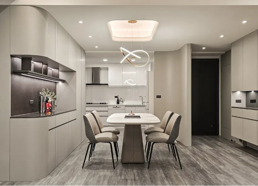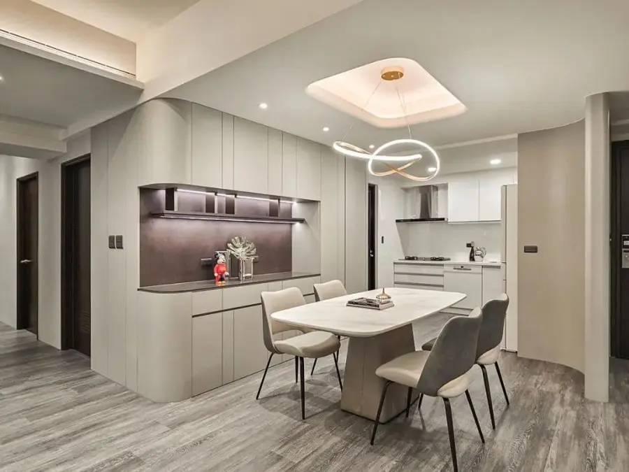 餐厅设计加入了弧形元素,整体效果更加柔和舒适。餐边柜加入了带有金属锈蚀感美耐板,复古韵味的铁灰色板材在灯光作用下,若隐若现的细致纹路,颇为有趣。餐厅以散发光晕的造型吊灯与LED灯条结合,增添不同韵味的光氛表情。