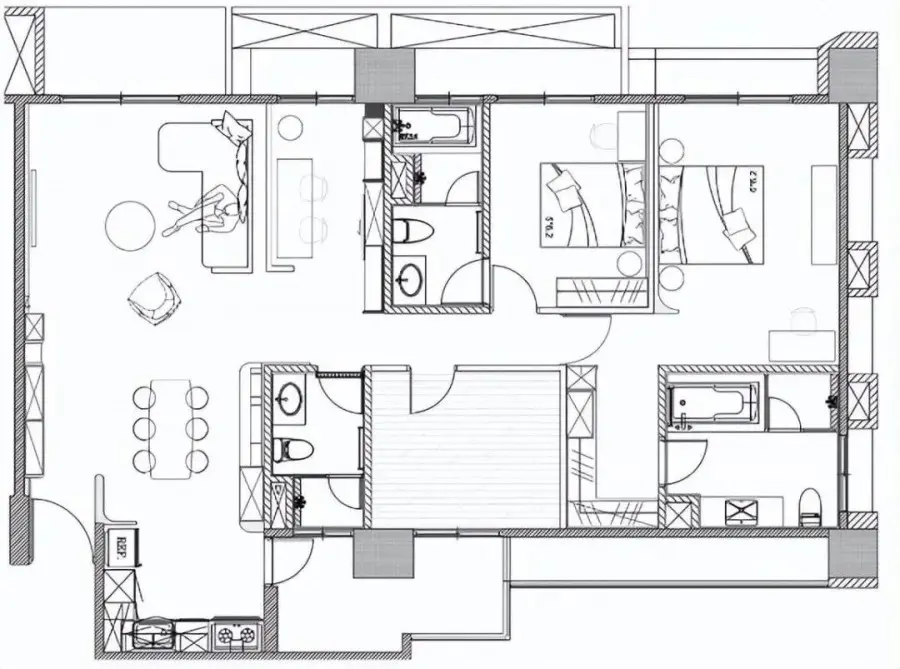 152㎡户型方正,原户型为三房一厅三卫布局。整体格局还是非常不错的,无需进行太大的改动,只需结合生活习惯做一些个性化的设计即可。