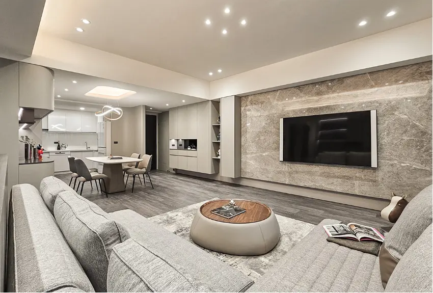 客厅保持了原始层高,让空间更加敞亮通透。略带浅灰色的耐磨木地板,深浅有致的木纹,让轻奢空间多了温润质感。大理石作为电视墙,亮面光滑质地夹杂流纹挥舞,映现不凡的品味与优雅大气。