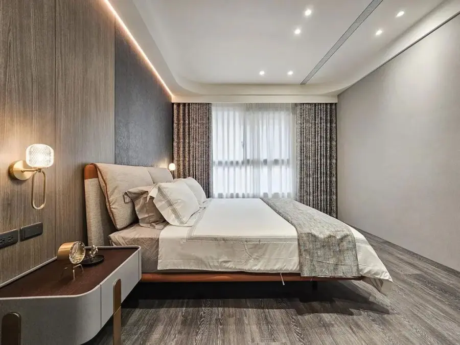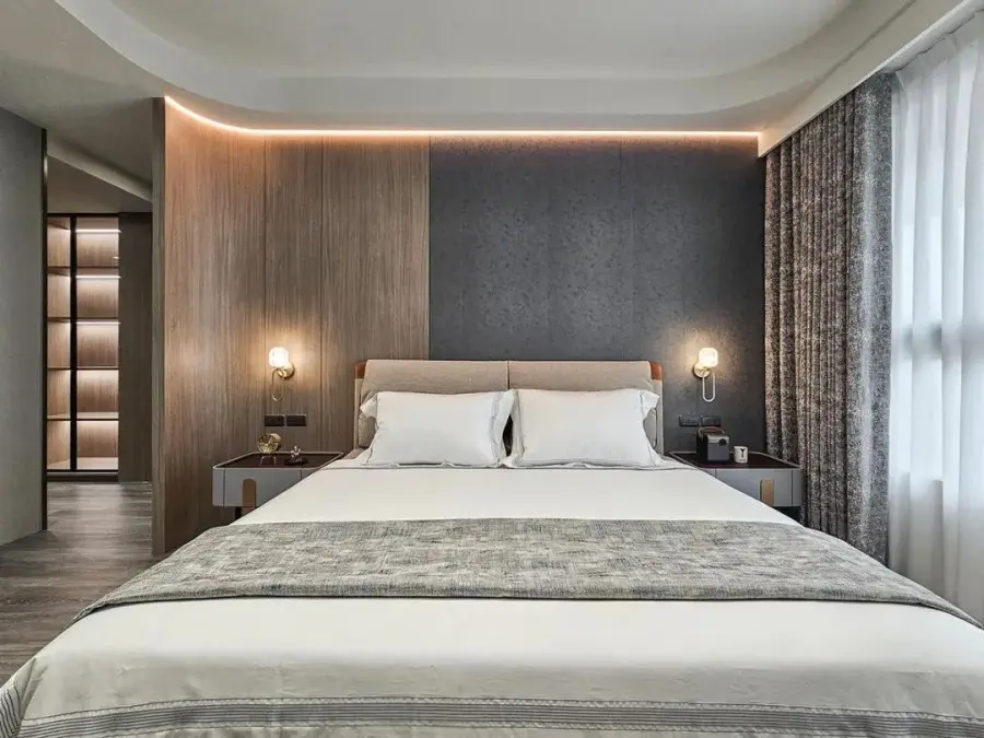 主卧沉稳大气有质感,挑选了两种不同材质做拼接,组成床头背景装饰。既有木质的温润,又有壁纸的沉稳,同时赋予了主卧空间的稳定性。天花转角处做了圆弧修饰,视觉柔和较少了直角锐利感。