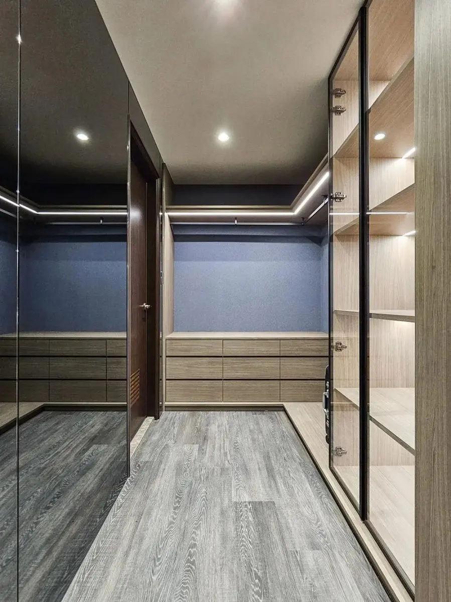 主卧衣帽间延续了沉稳基调,L型的吊挂区,配合玻璃橱窗和封闭式收纳,让收纳更轻松。带有反射特性的镜面,拉阔出空间感,视觉空间更显宽敞。