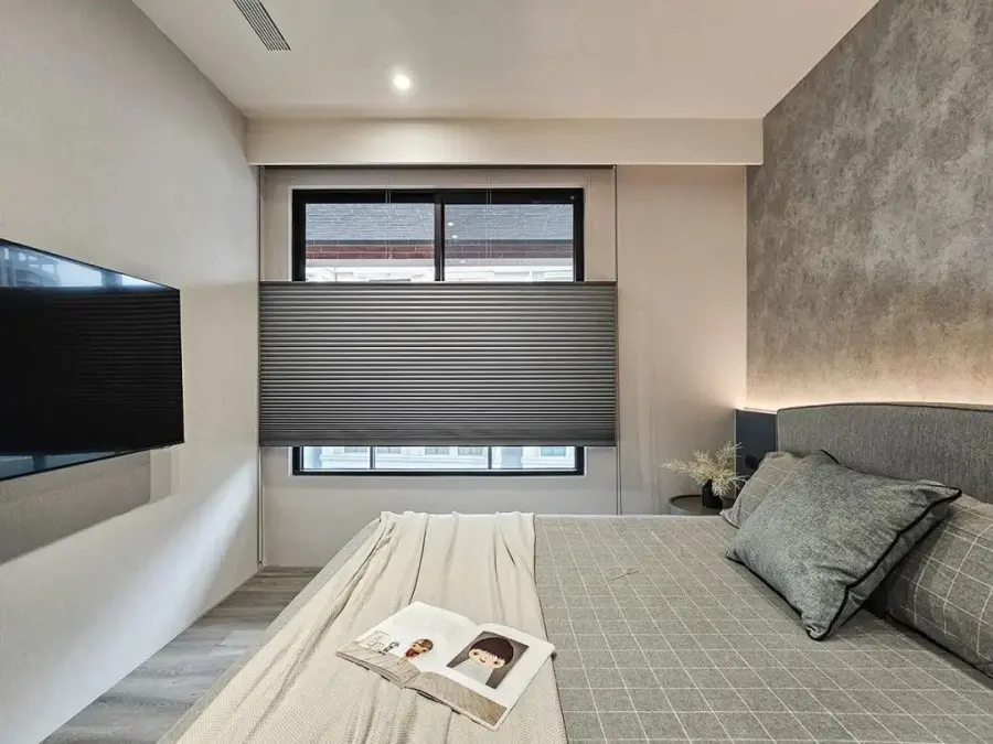 灵活可控的蜂巢帘设计,可以根据实际情况调节室内光线。床尾选用淡雅的灰色,安排穿孔线路方便安装壁挂电视。