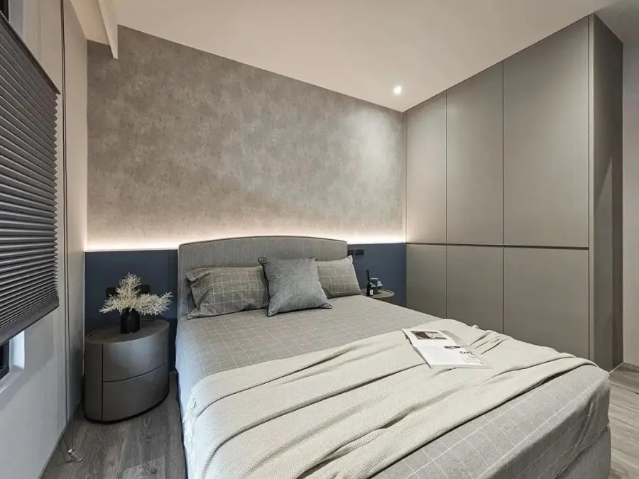 次卧以中性地彩度色调诠释舒适感,床头处铺陈灰韵轻浅流纹壁纸,搭衬绽放光氛的灯条,营造轻松舒缓的休舔氛围。