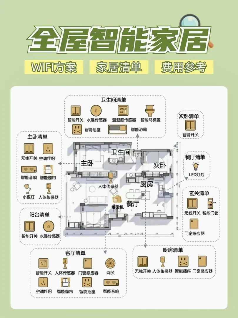 解放双手的全屋智能第一步,就是安装好网络一整理了常见的全屋 WIFI安装方式、家居清单和费用,涵盖灯光、家电控制、窗帘和安防内容,大家可以参考哦!
