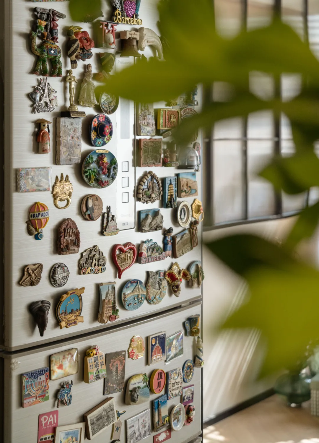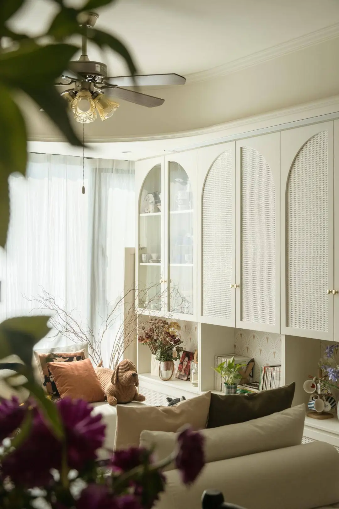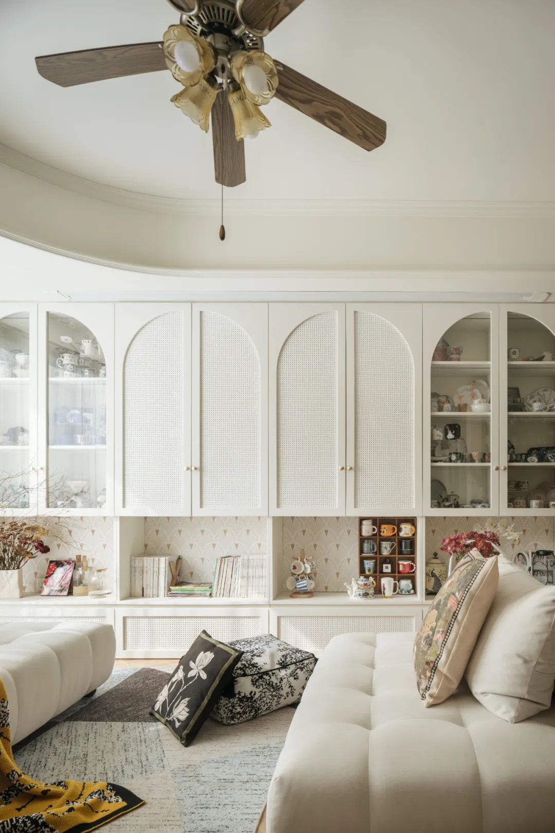 装饰柜上摆满了各种瓷器、摆件、盆栽甚至手办,每一件都承载着浓厚的怀旧情感和独特韵味。
