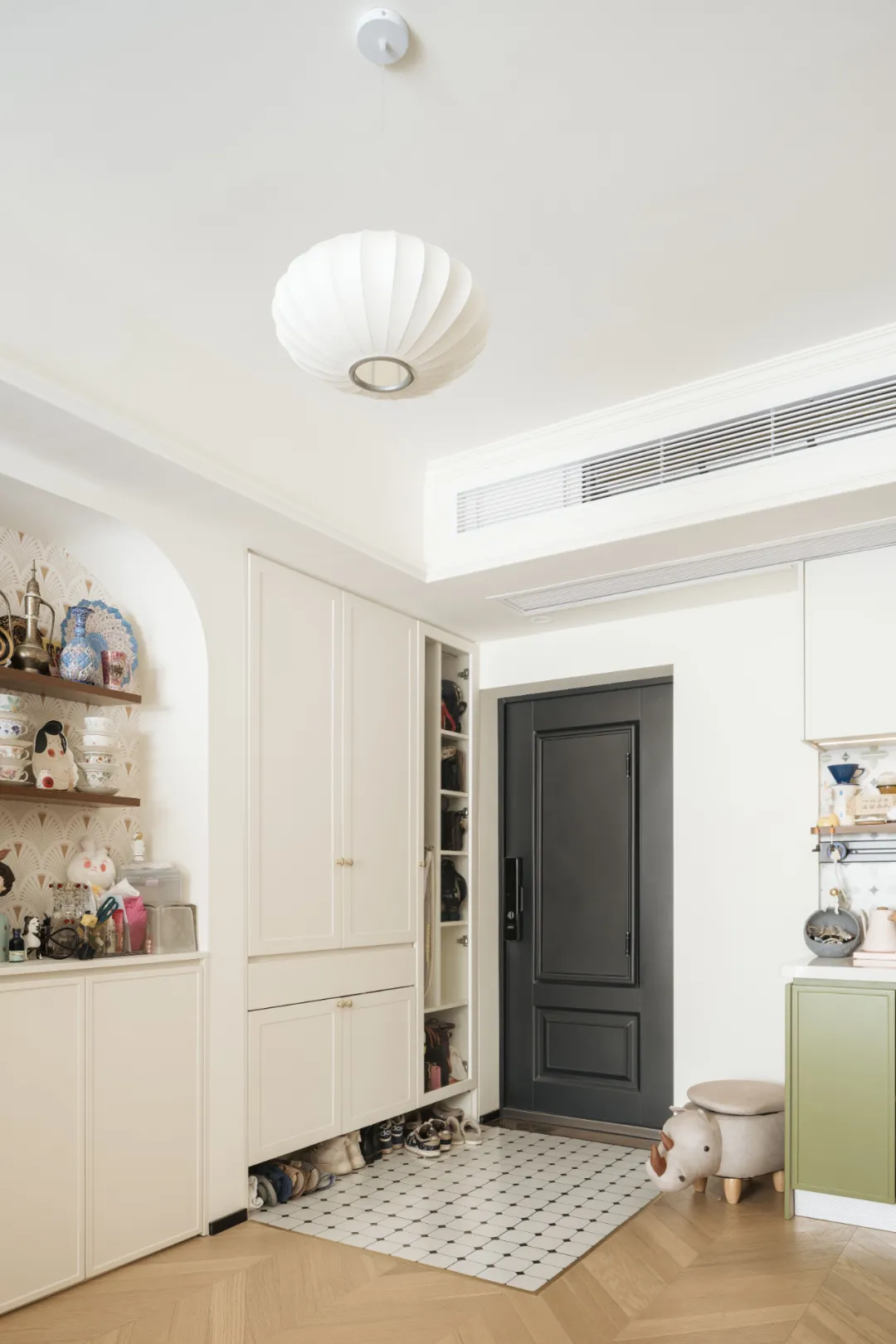 一踏入家门,首先映入眼帘的是玄关处两米高的悬空鞋柜。这款设计不仅实用,而且兼具美观。