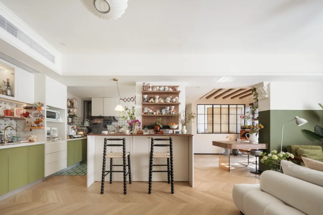 自然惬意的风情绿色橱柜,配上绿植花砖,极大地增加了视觉的开阔感。