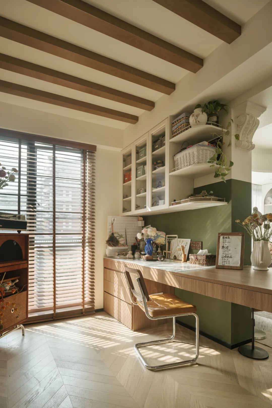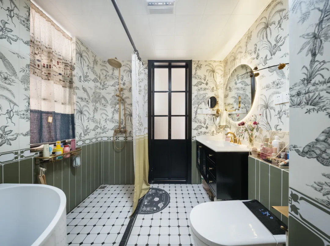 卫生间的设计同样别具匠心,上下半墙采用复古绿+水墨画转的设计,细腻的纹理中和了色调,减少了复古绿的沉闷感。