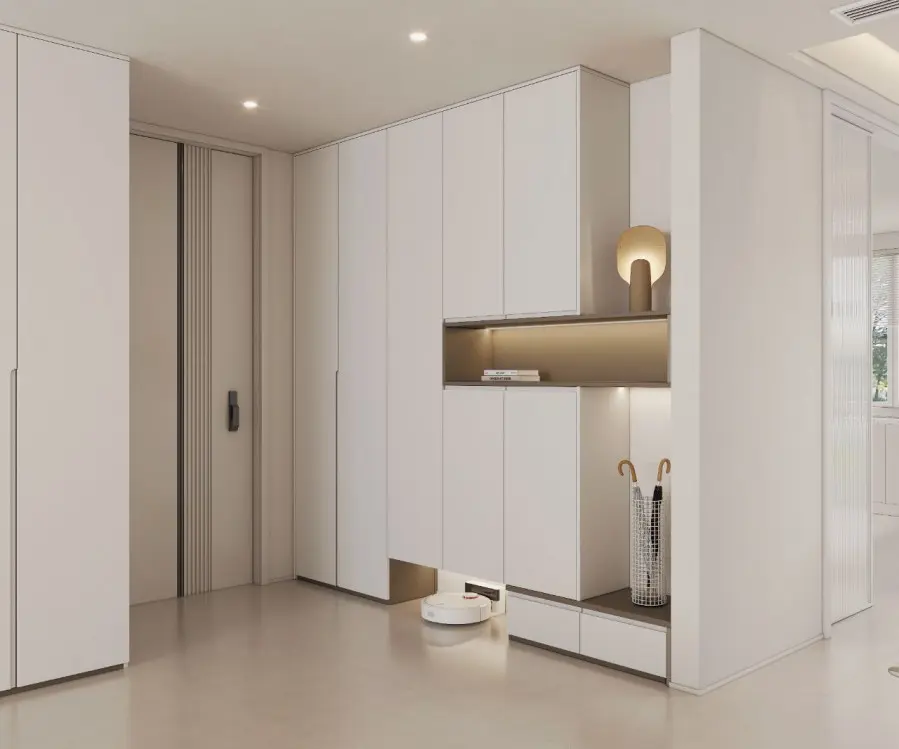 进门定制到顶柜,中间留空放钥匙,底部还给扫地机器人做了一个“家”,整洁又干净,喜欢喜欢