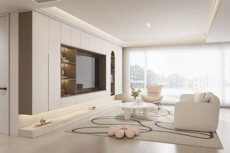 电视柜+储物柜都是一个系列,搭配木色开放格和灯带增加层次感,再配上绵软粉嫩的沙发,甜到心里去了