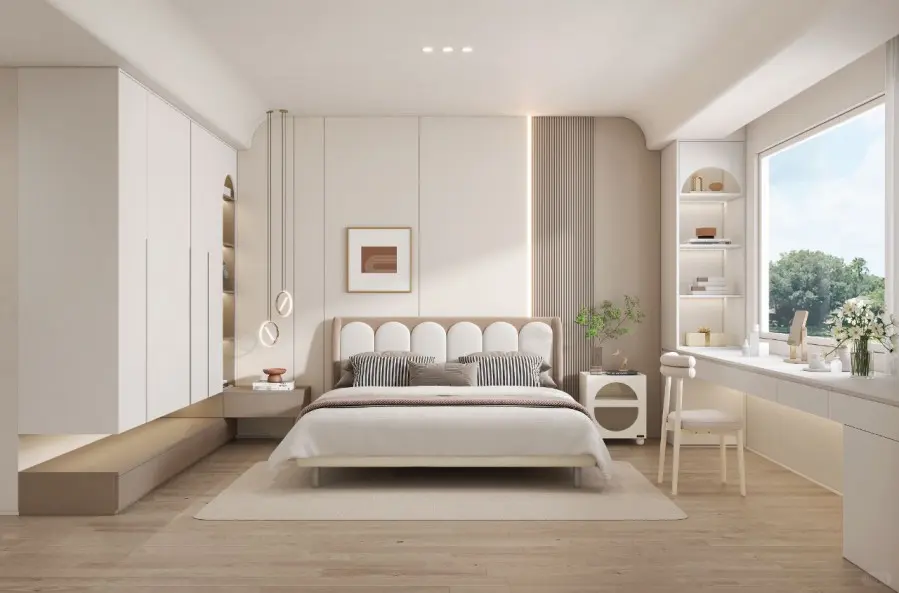 讲真,悬浮衣柜+地台超有设计感!!靠窗定制储物柜+台面,办公梳妆都可以,实用到失语!