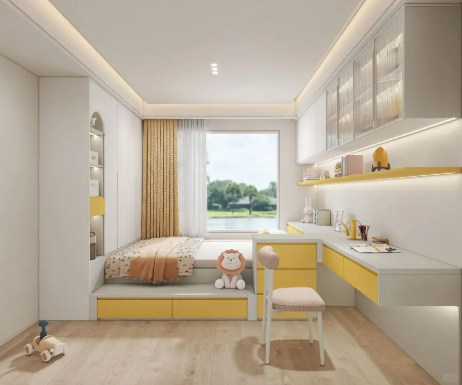 儿童房做榻榻米+衣柜+书桌柜设计,不仅整体性强,而且很实用,睡觉、储物、学习都能满足