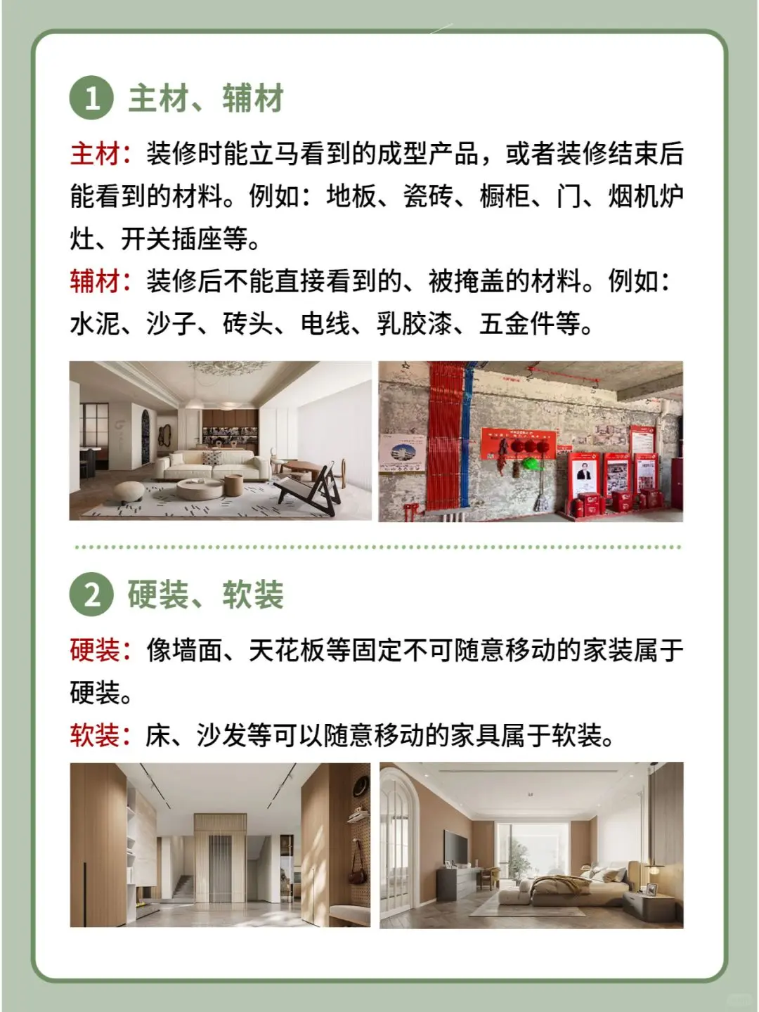 1、主材、辅材 主材:装修时能立马看到的成型产品,或者装修结束后能看到的材料。例如:地板、瓷砖、橱柜、门、烟机炉灶、开关插座等。 辅材:装修后不能直接看到的、被掩盖的材料。例如:水泥、沙子、砖头、电线、乳胶漆、五金件等。