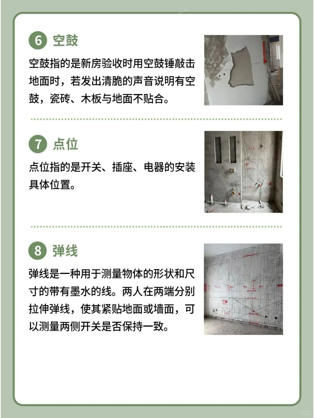 8、弹线 弹线是一种用于测量物体的形状和尺寸的带有墨水的线。两人在两端分别拉伸弹线,使其紧贴地面或墙面,可以测量两侧开关是否保持一致。