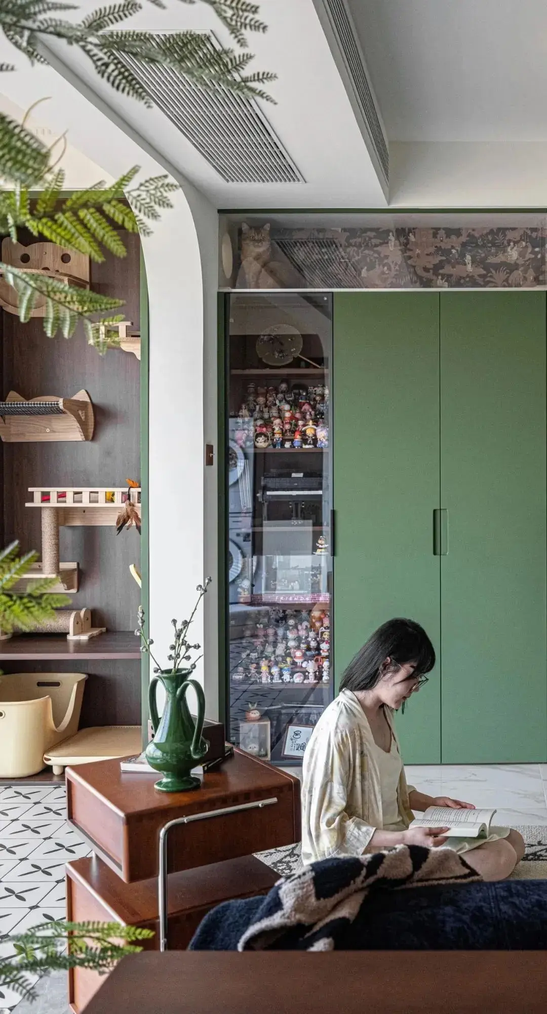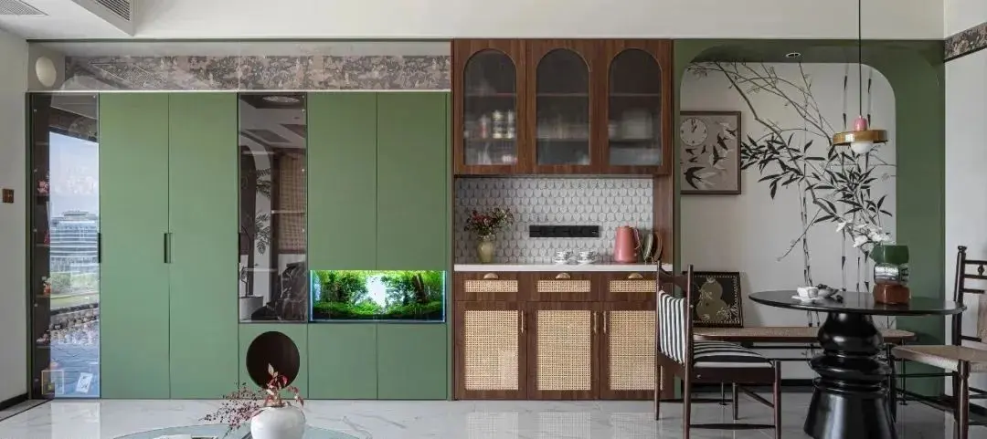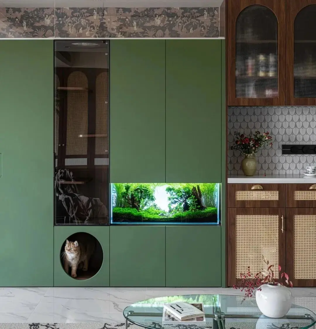 在柜体内置入猫爬架和鱼缸,这样的多功能设计有效地利用了空间,同时满足宠物猫的攀爬习性和观赏鱼的需求。橄榄绿的配色独特且富有深度,营造出复古高雅的氛围。