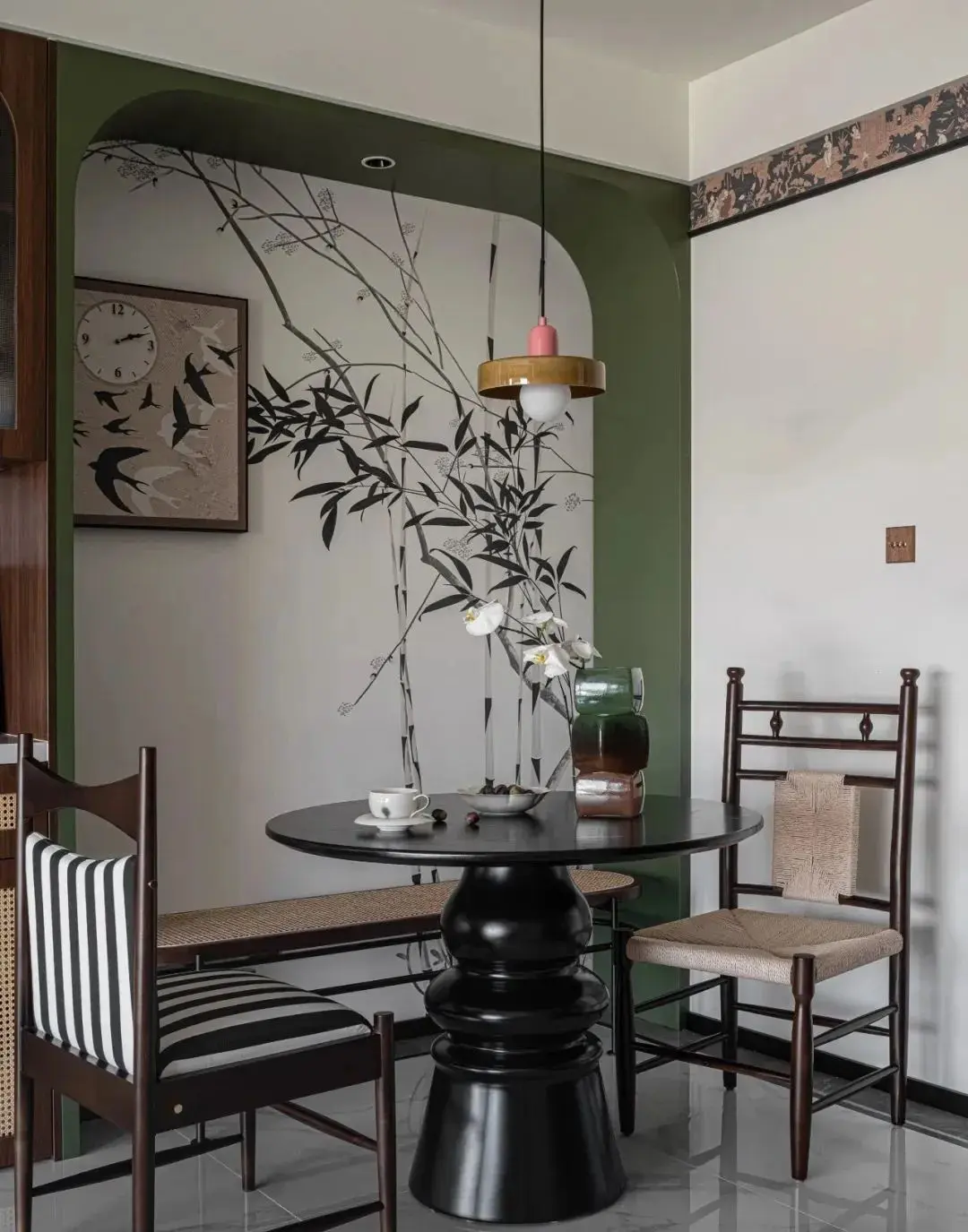 橄榄绿的垭口造型,与客厅背景墙相呼应,加入弧形元素,提升空间颜值的同时又带来了一丝清凉感。竹叶墙布+燕子电表箱装饰画的组合,让整个背景墙形成了一处端景,显得格外静谧,自然元素的融入为空间带来生机,呈现出别具一格的复古韵味和优雅氛围。