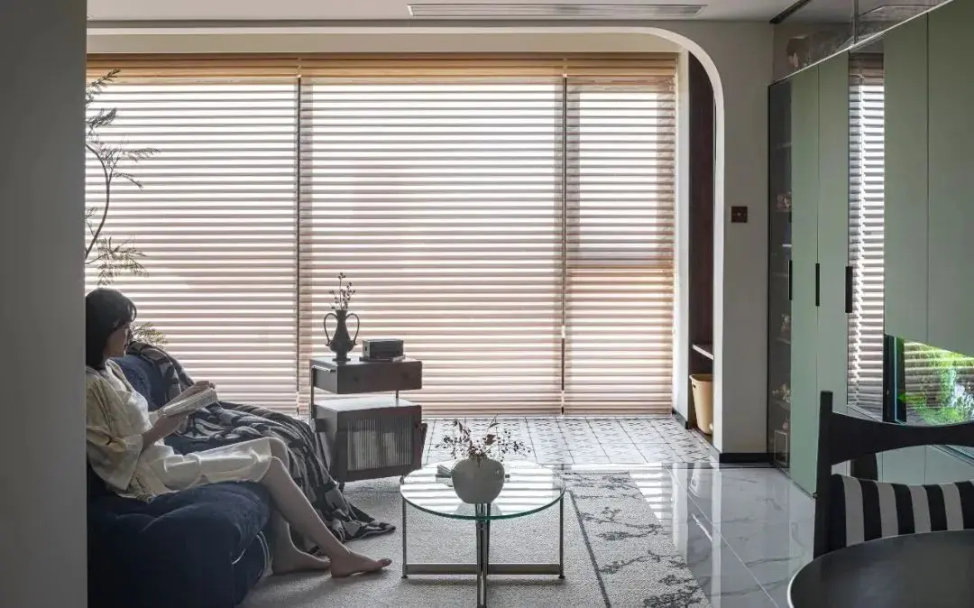 进入室内,客厅与阳台连通,将空间释放出来,动线也更加自由灵活。阳台门洞的圆弧处理增添了空间的柔和之美,地面铺设清新的小花砖,配合上超大的落地窗,在光线的映射下,营造出复古浪漫的度假氛围。