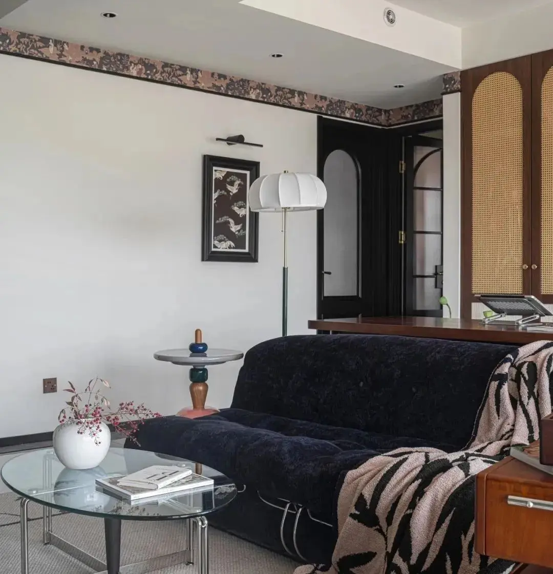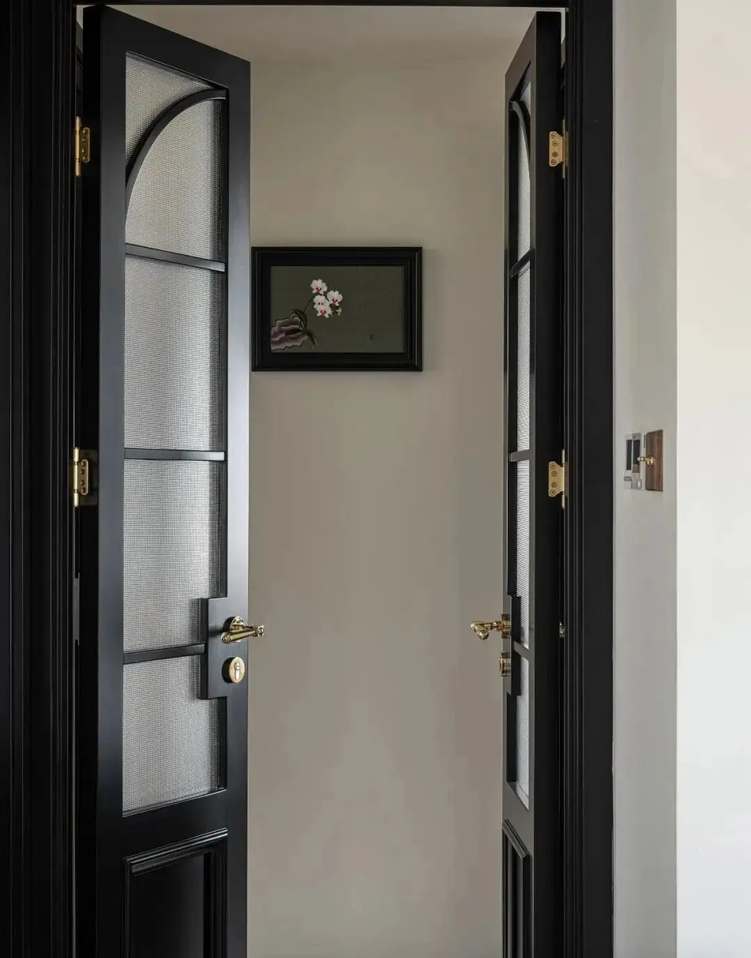 一扇复古双开门的开合,成为公区与卧室的动静区分界线,黑色木质搭配超白水晶玻璃,营造出复古精致的氛围。