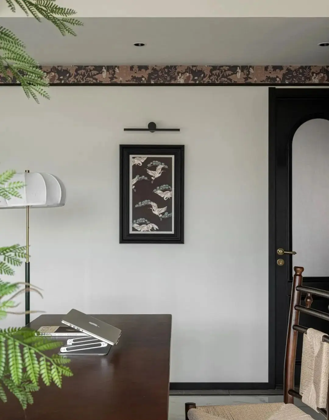 开放式书房毗邻过道,墙面点缀一幅花鸟装饰画,配上壁灯,给书房增添了一抹复古美感和文化氛围。