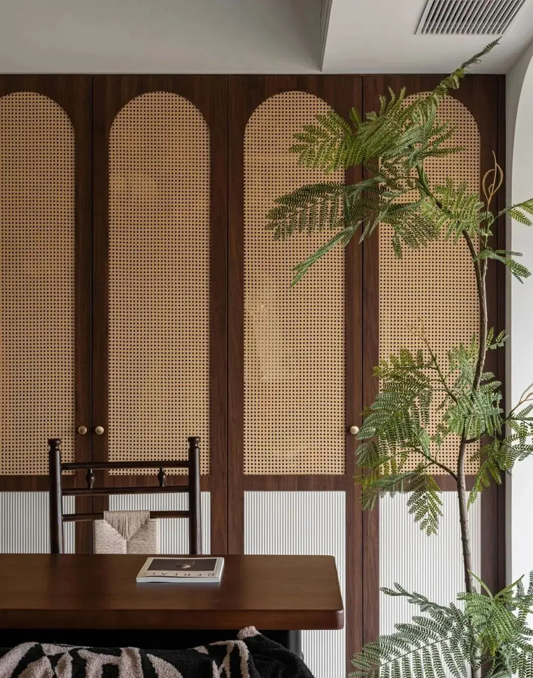 定制满墙书柜,增加收纳空间,藤编与波浪纹的运用,与自然沉稳的木质搭配,整体显得自然质朴,拱形的造型与餐边柜相呼应,增加空间的层次感和美观度。