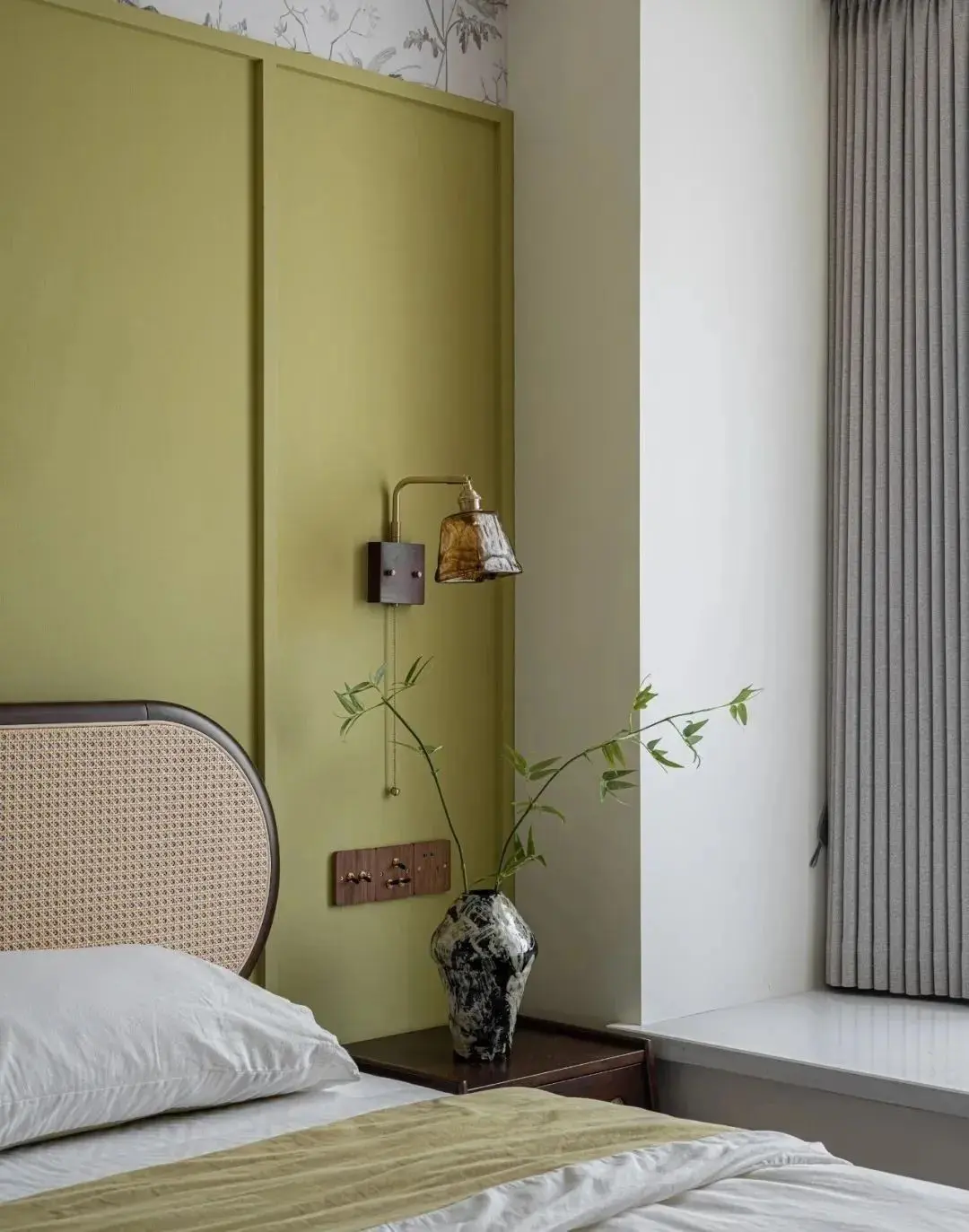 卧室意在勾勒一幅松弛惬意的治愈画卷,床头背景墙采用彩色半墙+花鸟墙布的方式塑造中古风的独特魅力,清新治愈又养眼。实木藤编材质的床+床头柜组合,不仅美观,还具有一定的透气性,为空间带来自然清爽的气息。