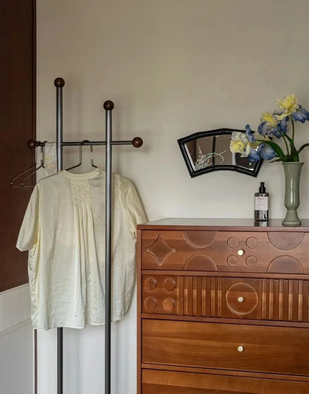 角落布置一款衣帽架,方便屋主随时取用常穿物品,不锈钢与实木碰撞出精致之美,实用且美观。