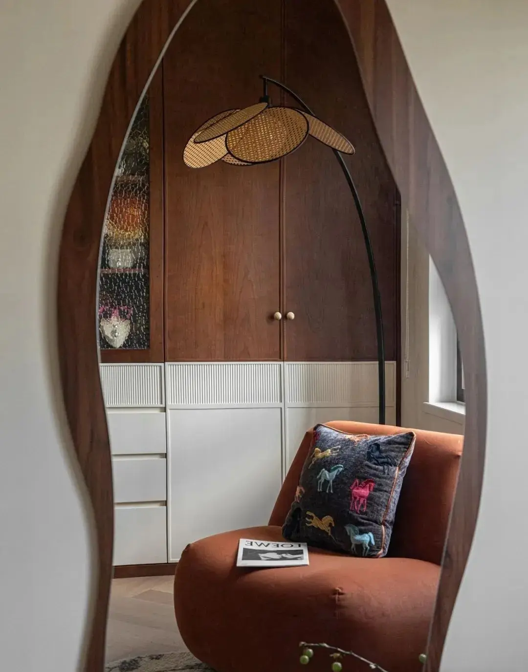 悬挂一块胡桃木的穿衣镜,天然的木质纹理和温润的色泽,能够为室内增添一份自然质感;不规则的造型又增加了空间的视觉层次。
