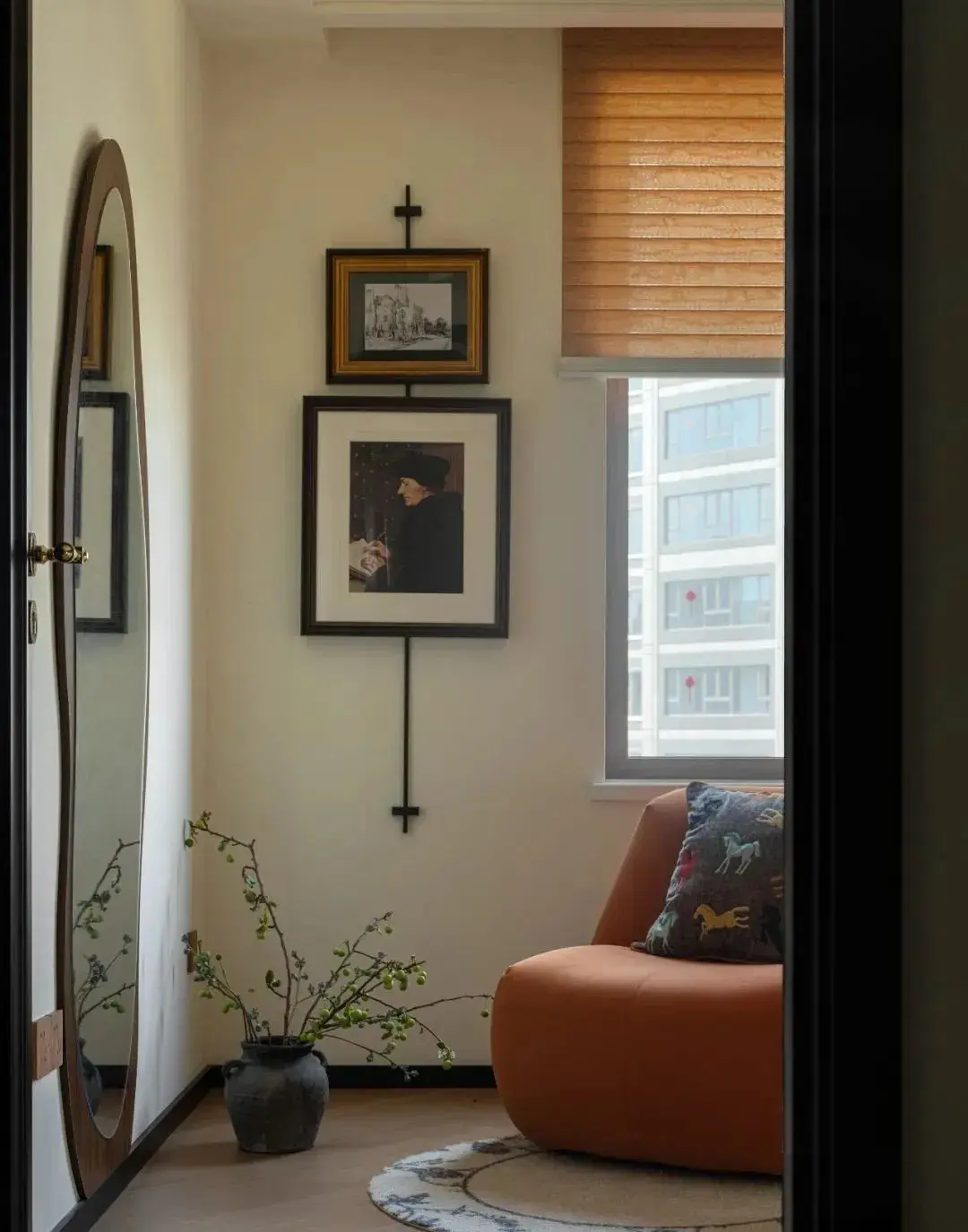 原北次卧作为衣帽间,附带休闲功能,不仅能够提高空间的利用效率,还能为屋主带来更加舒适和便捷的生活体验。映入眼帘的复古装饰画,提升了整体空间的品质。