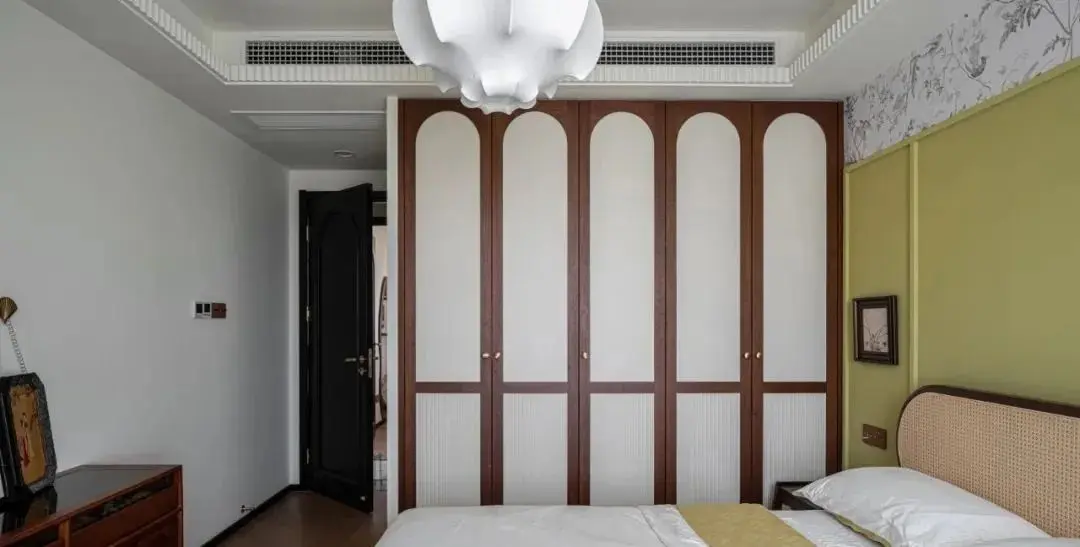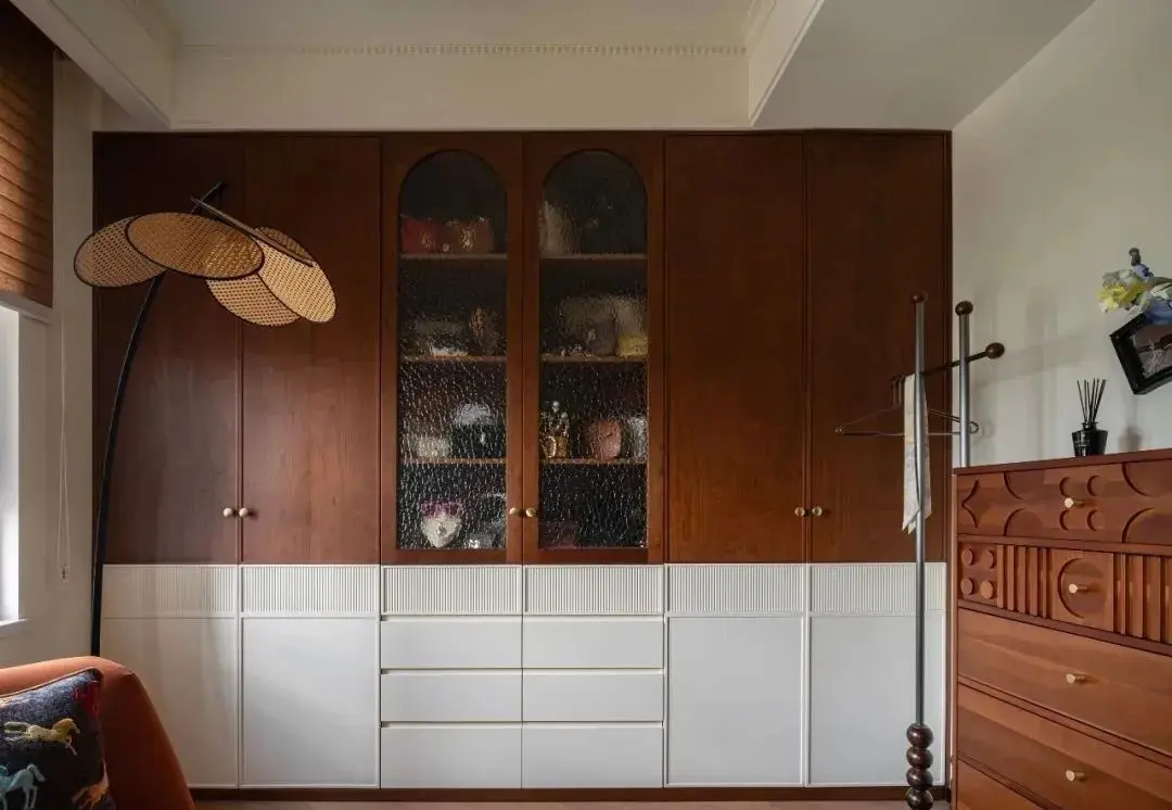 深木色+米白色的衣柜,柜门点缀波浪纹,搭配黑色的房门,在色彩上形成强烈的对比,使空间更具层次感;拱形元素的加入,提升了空间的美感,瞬间焕发出古典韵味。