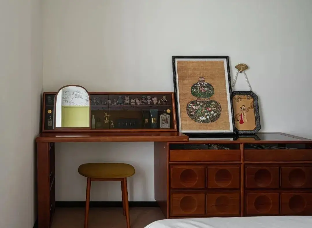 床尾布置一体的斗柜和梳妆台,既能收纳又能梳妆,在方与圆、直与曲的对比中融生美感艺术。