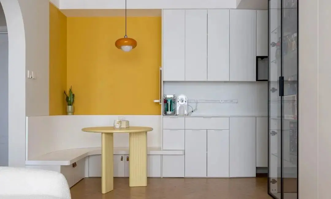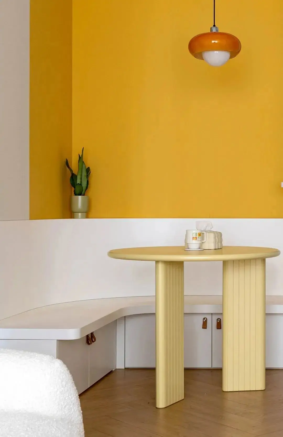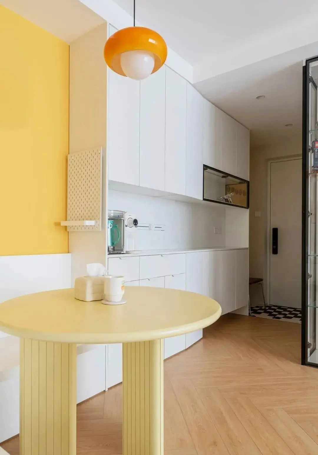 ▲ 沿入户动线来到客餐厅,通铺人字拼木地板增强空间感,餐厅墙面用柠檬黄做拼色背景,点缀活力