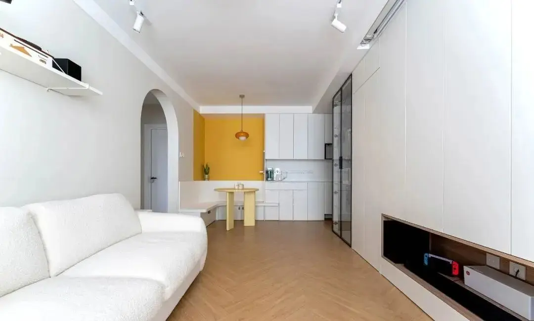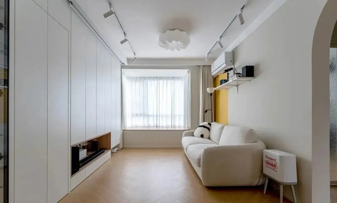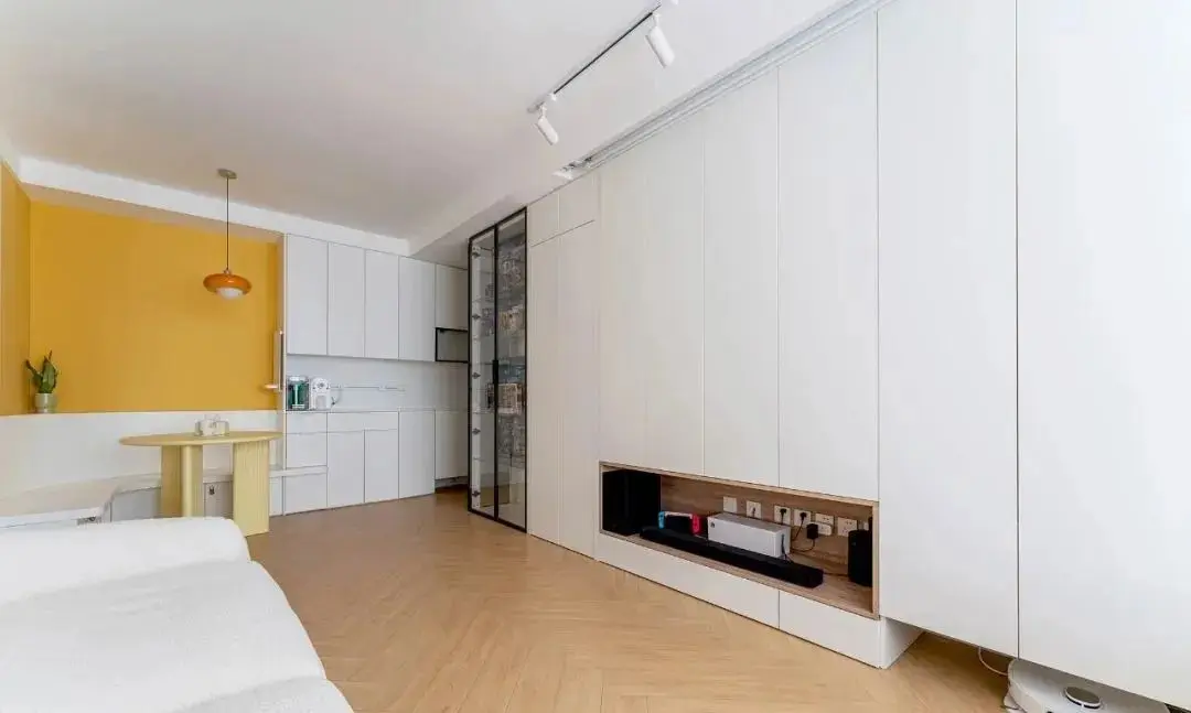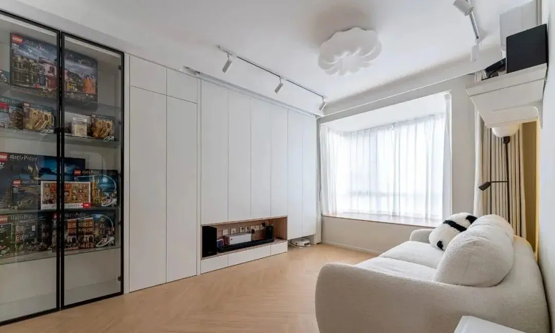 ▲ 客厅打造总长4.3m的满墙柜,收纳能力强,下方还预留了扫地机器人充电位