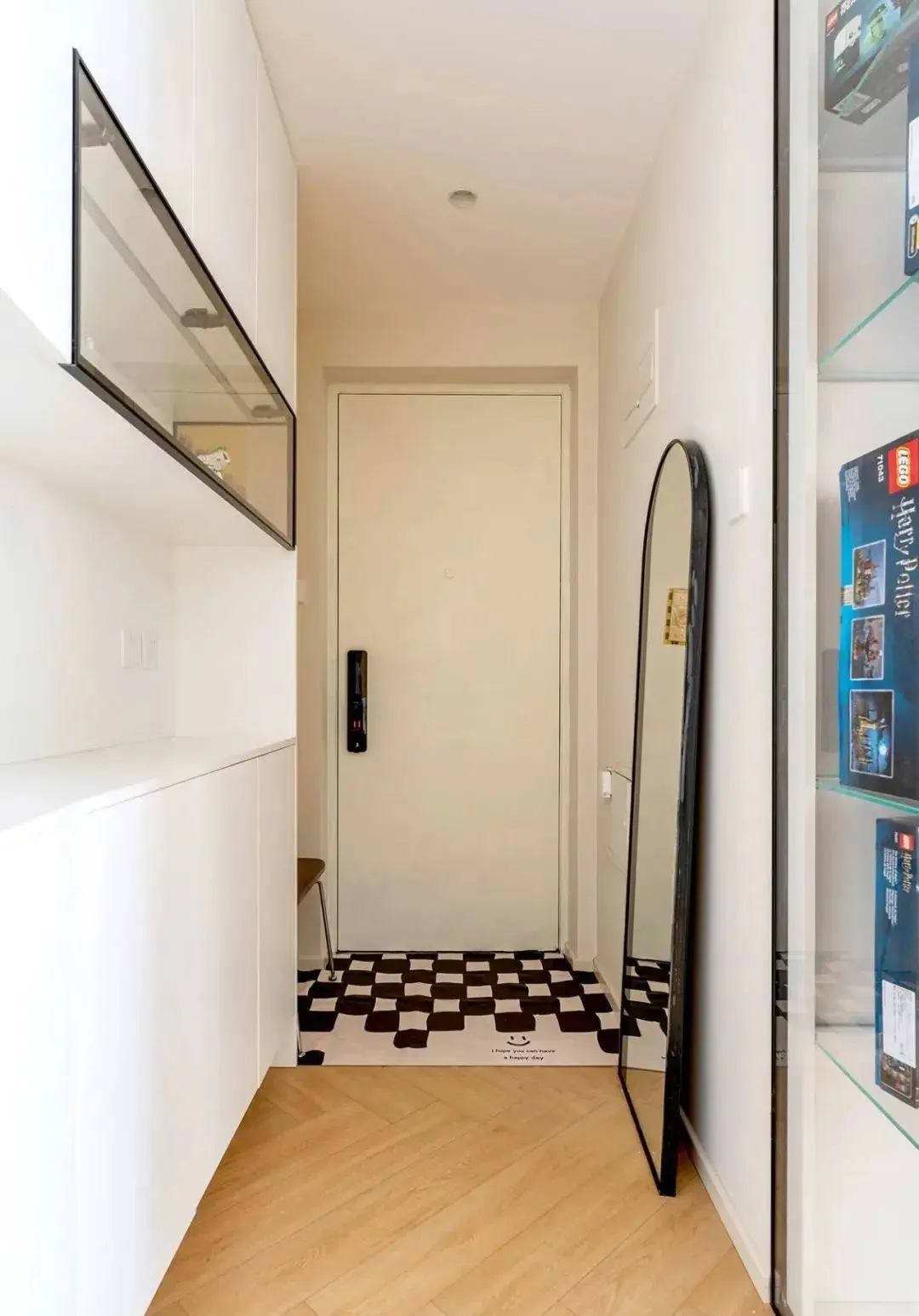 ④门厅走廊定制玄关柜与餐柜相连,形成收纳联动。客厅满墙收纳柜,并将厨房入口隐藏其中,增强整体感。
