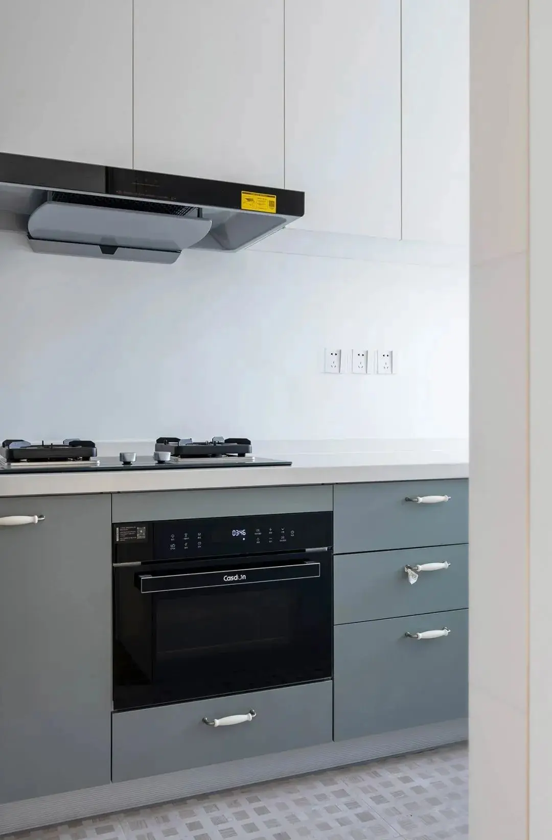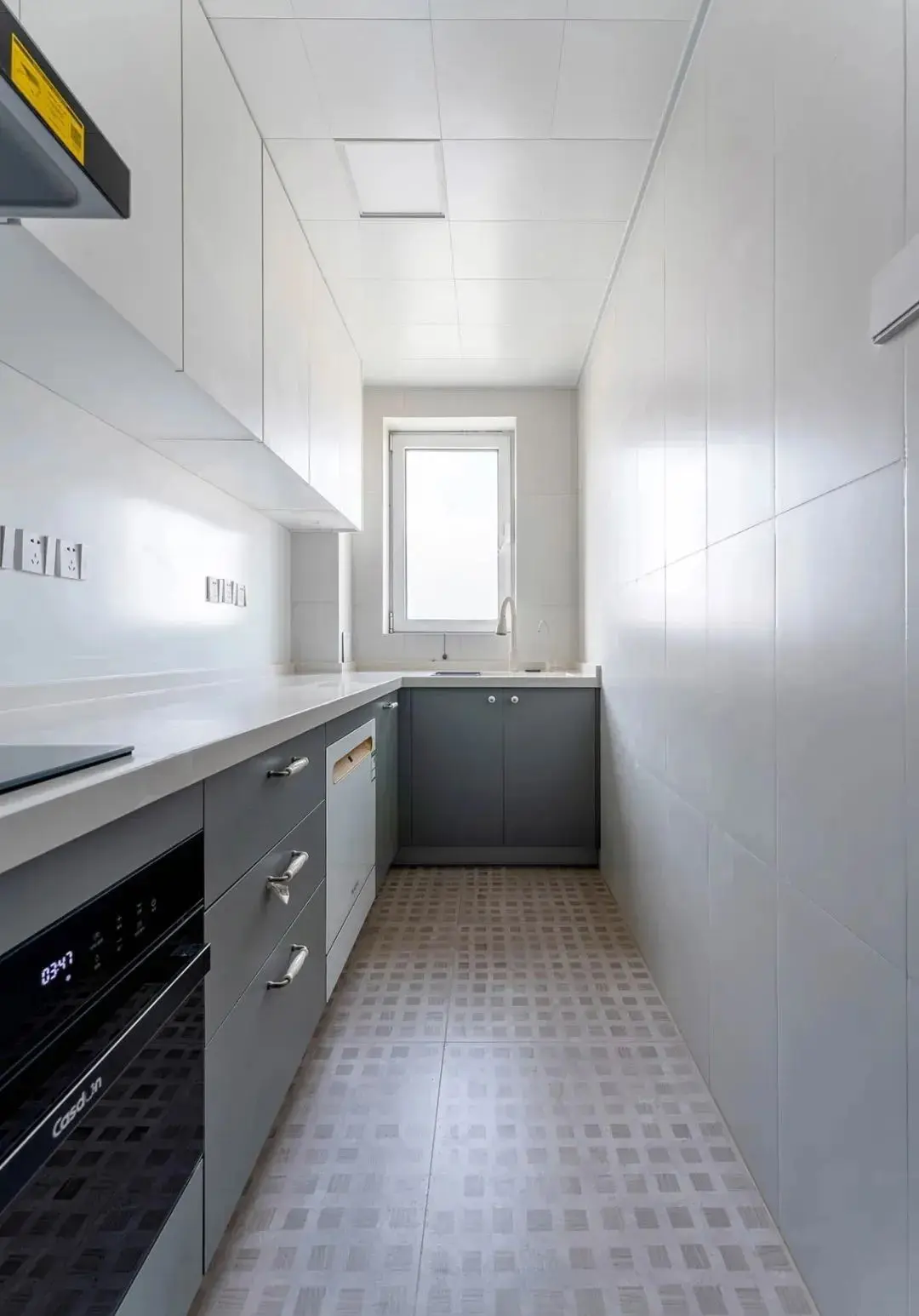▲ 选用烟灰色地柜+白色吊柜,耐脏的灰色格子地砖与地柜相近