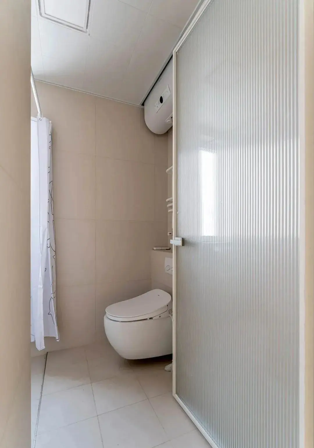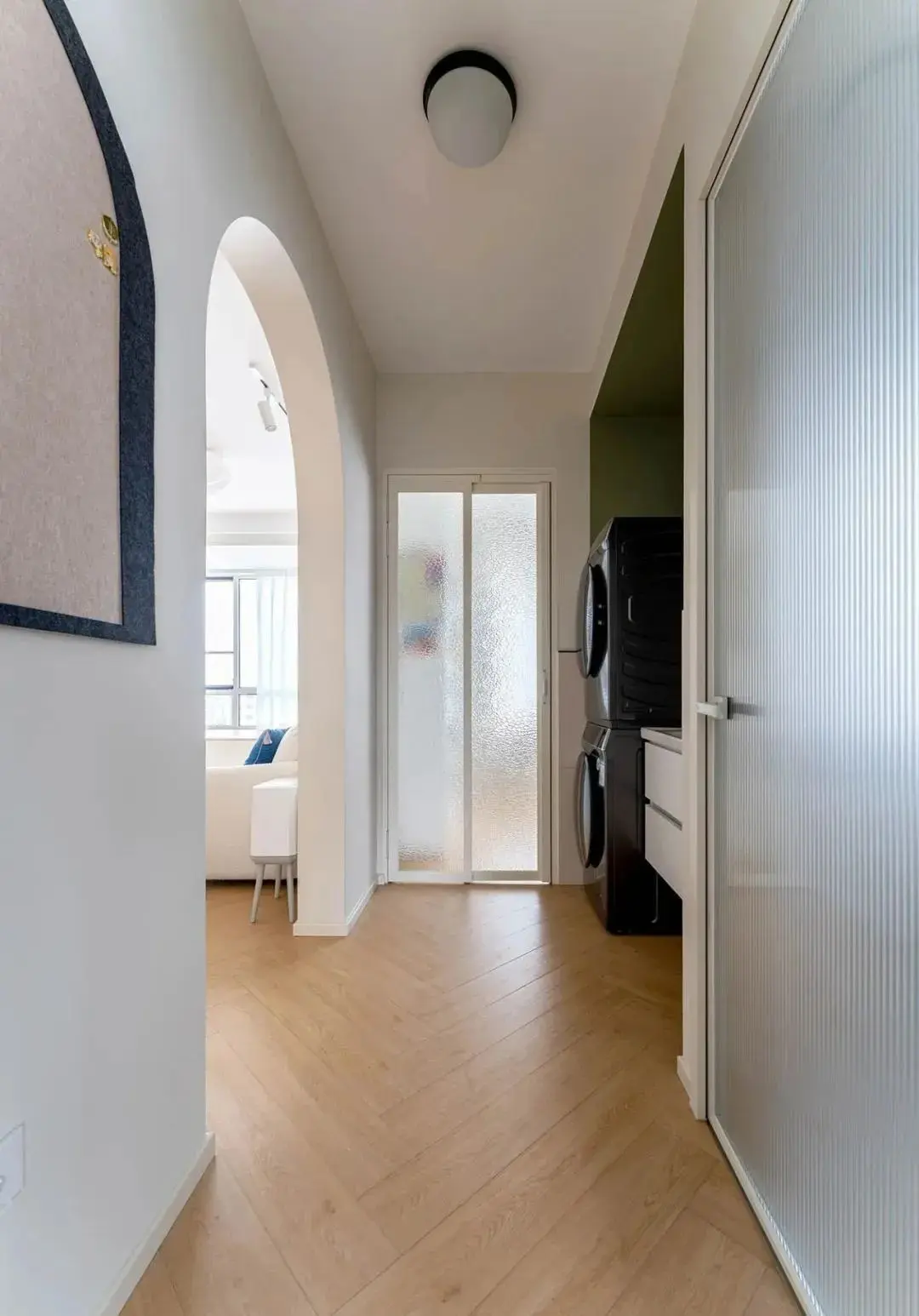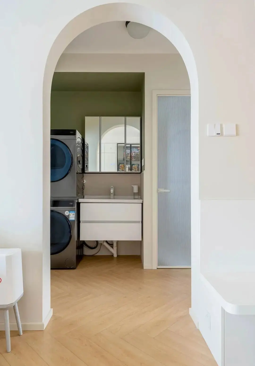 ▲ 卫生间将洗漱区移至走廊,实现干湿分离,一旁叠放洗烘套装。湿区选用长虹玻璃门,保证隐私的同时,还能兼顾采光