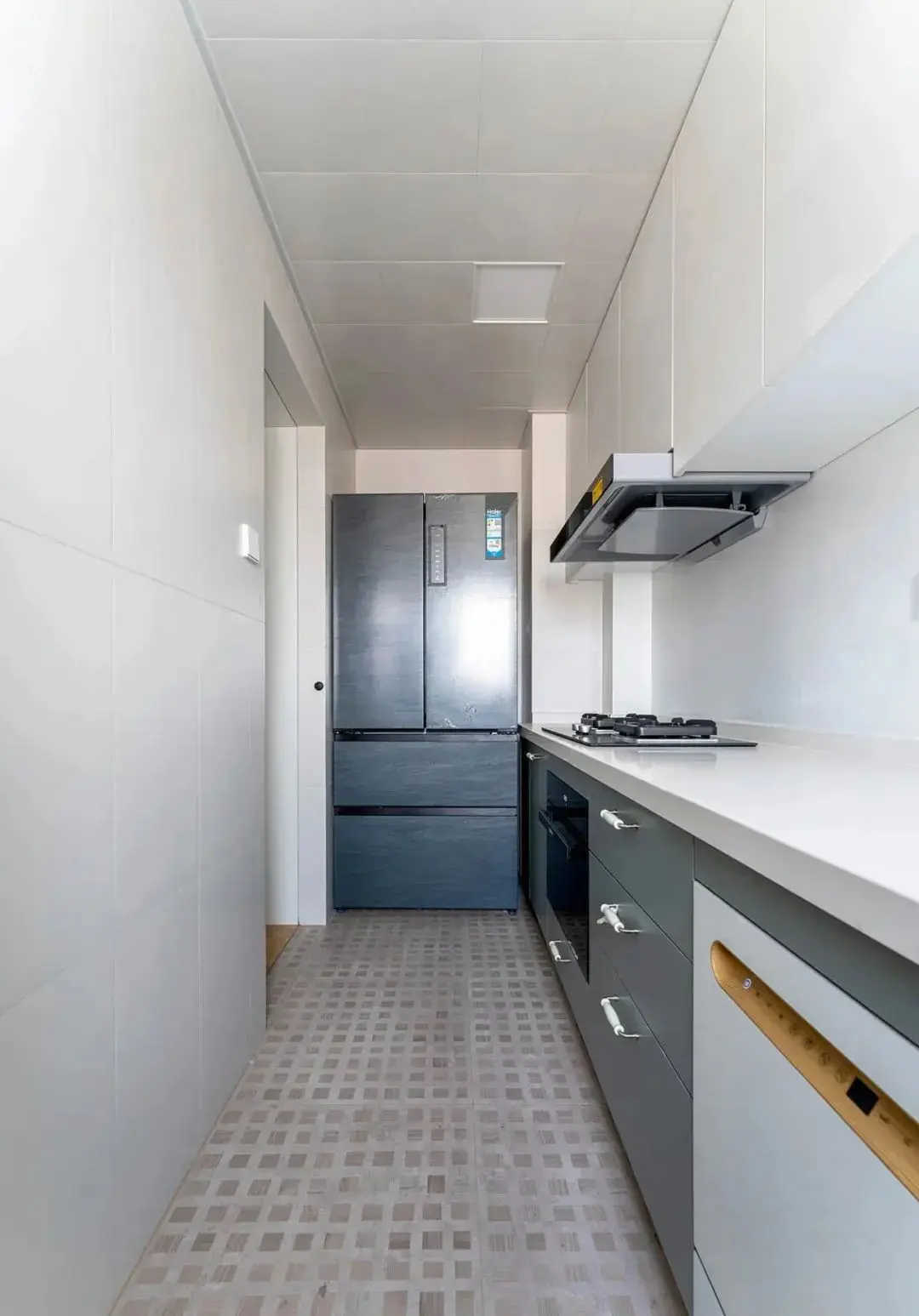 ▲ 厨房入口处留空,刚好可以嵌入一台双门冰箱,空间利用率高,使用也很顺手