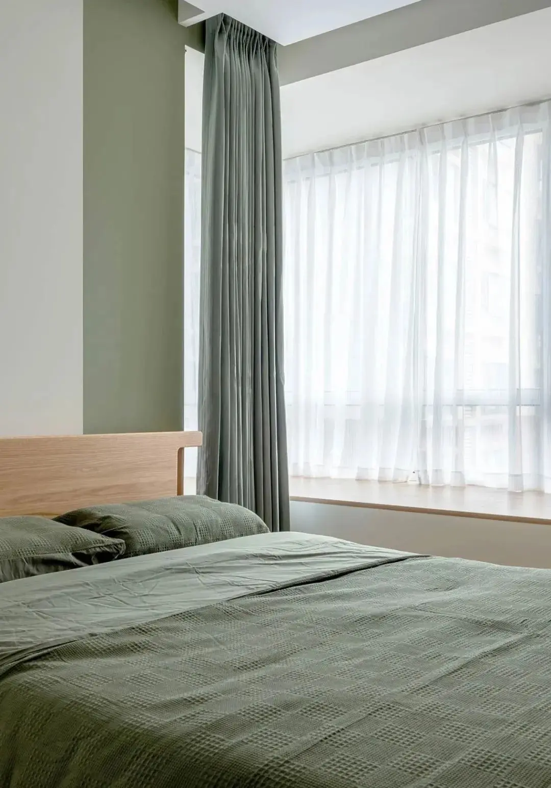 ▲ 墨绿色的床头背景墙,搭配同色系的床品与窗帘,营造出自然感的森系卧房