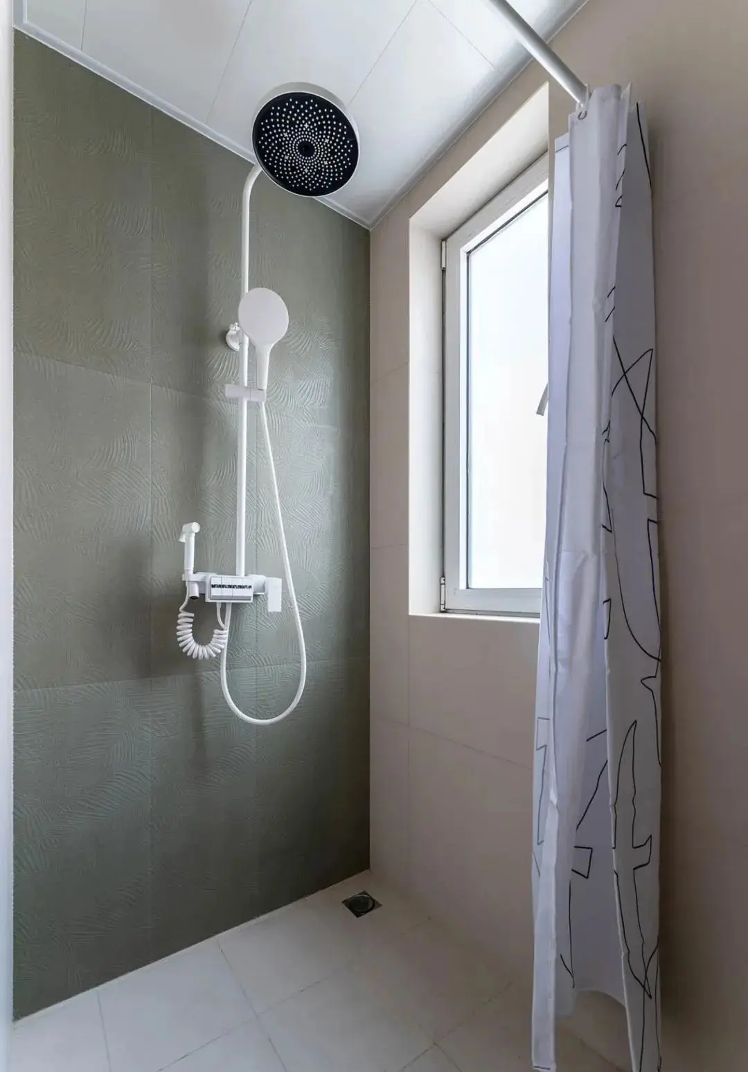 ▲ 淋浴区背景铺贴浅灰色墙砖,独特的纹理让空间更显立体