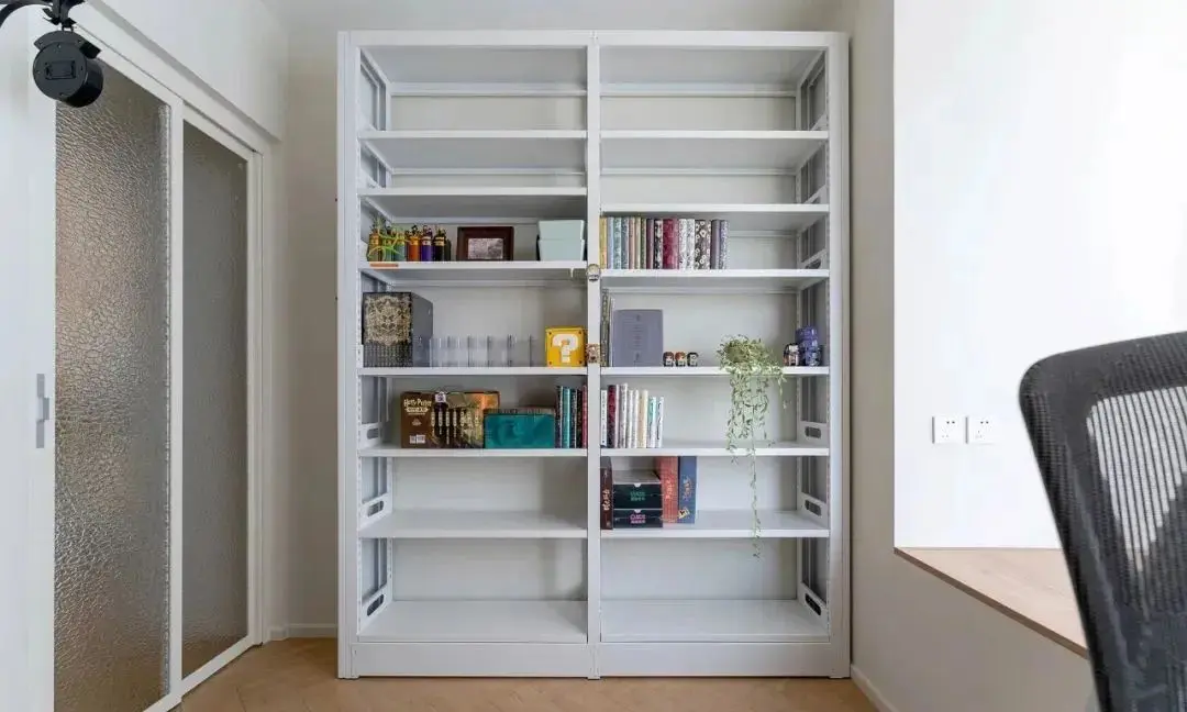 ▲ 书桌背后是一组钢制的拼接书柜,层高可以自由调节,满足不同大小的书籍存放