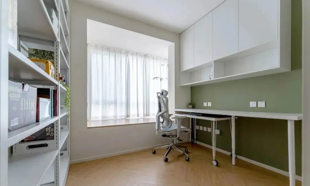②将次卧打造成书房,并调整了外侧的墙体结构,打造壁柜来增强收纳空间;