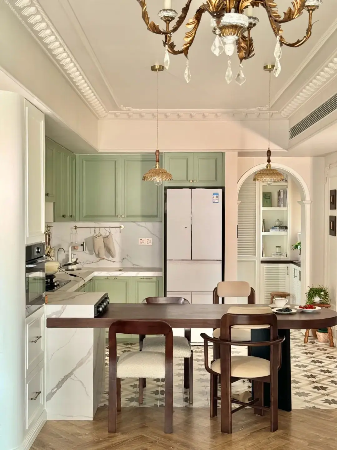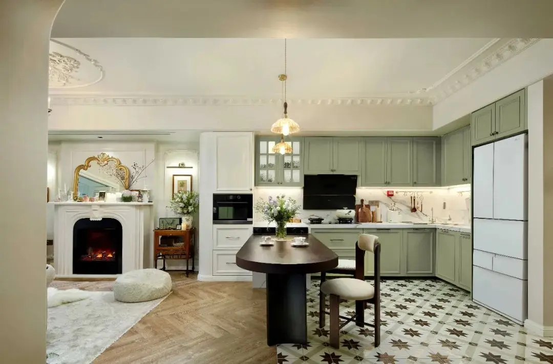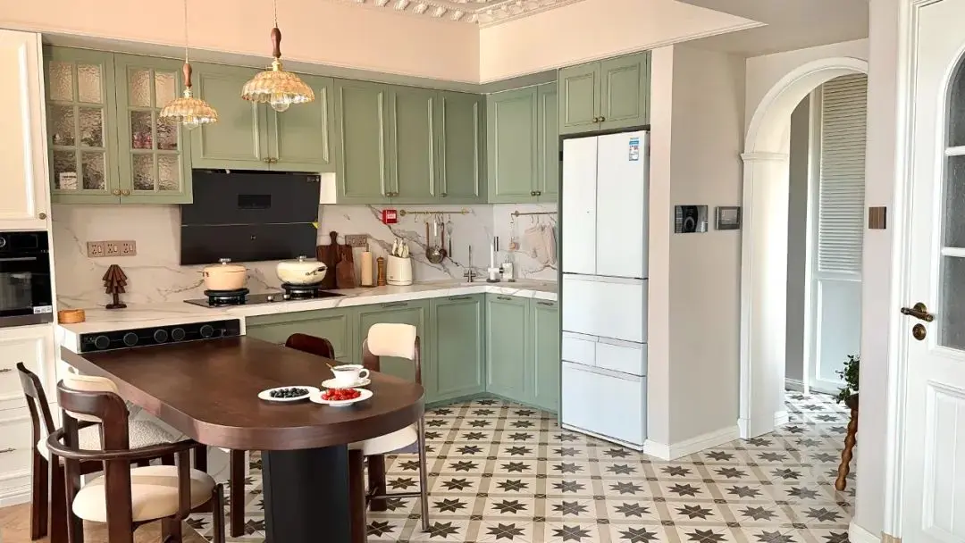 厨房以浅绿色和白色为主色调,这两种色彩搭配在一起加上大理石,既显得清新雅致,又不失家的温暖。木质地板的加入与瓷砖衔接,区分客餐厅,更是为整个空间增添了一份自然的韵味和舒适的触感。