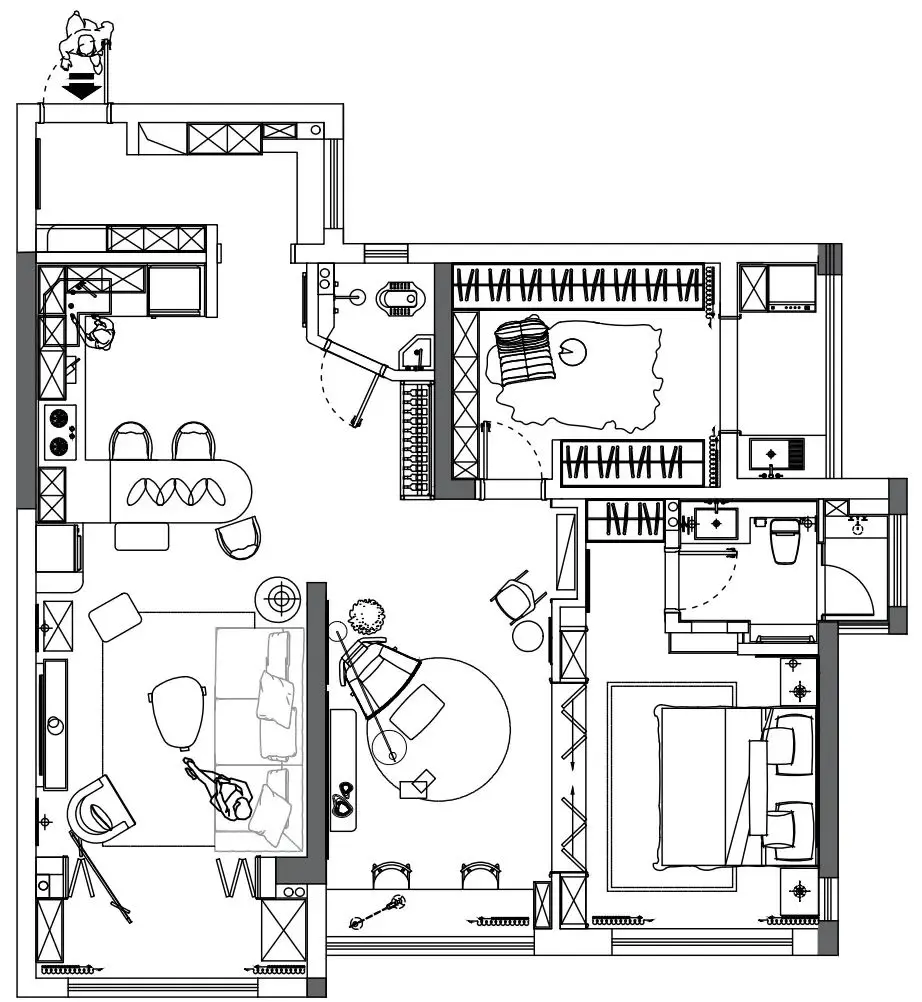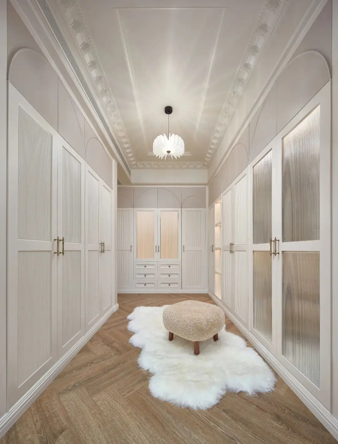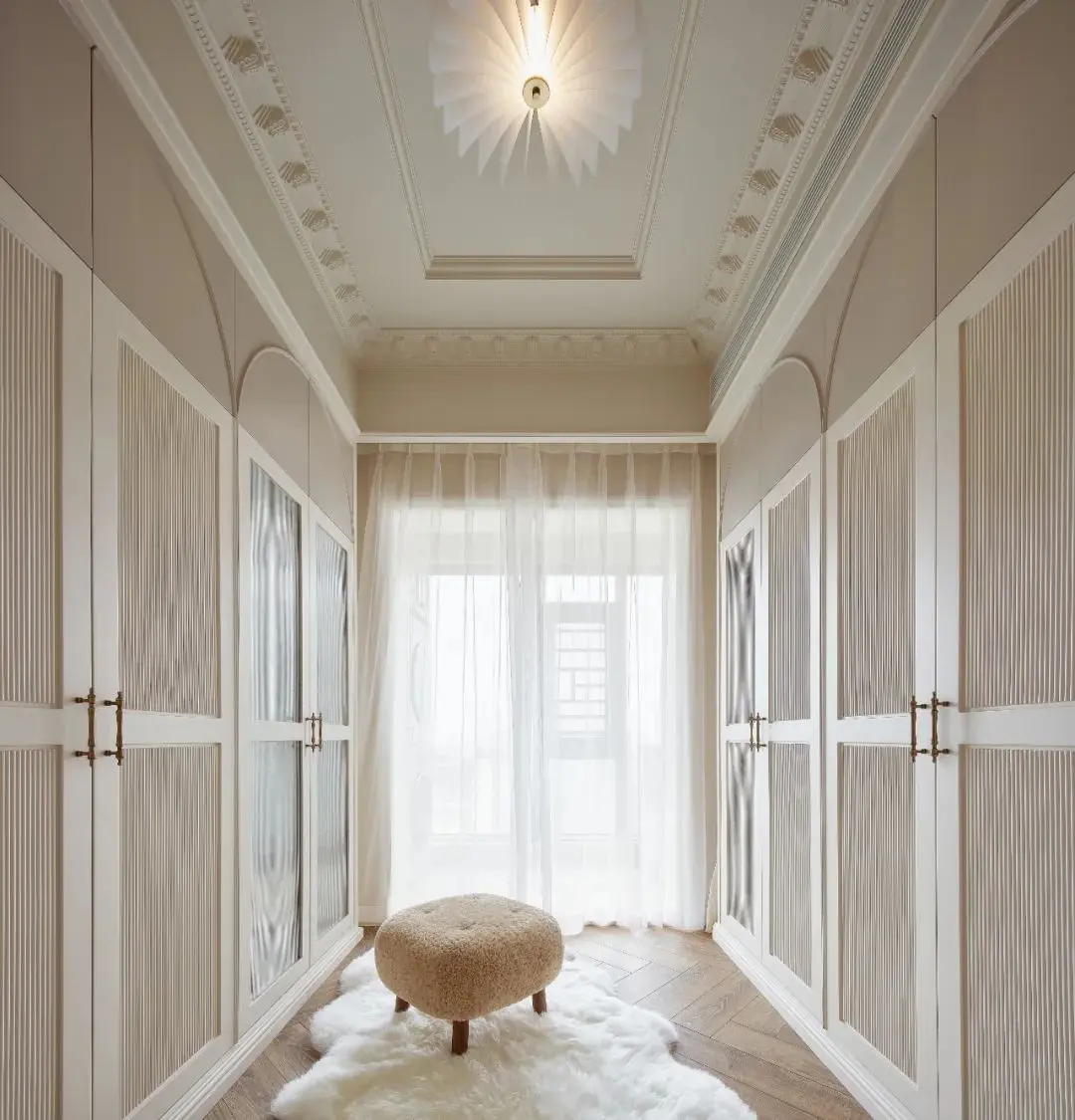 利用上进门左手边300厚的沉重墙,用来做健身衣物,瑜伽器材的收纳,其余左右两面墙做了一面到顶的衣柜,满足居住者的收纳需求,奶油雪糕的配色搭配简单的线条,勾勒出法式的浪漫气氛。对开经典玻璃造型门,更是增加优雅的氛围感~
