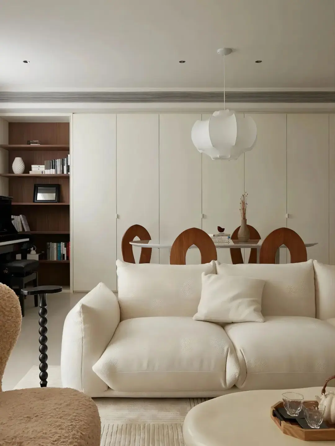 基于奶油风调性,设计师大面积留白的处理让整个空间干净简洁,奶油色系打底,精致优雅的家具营造出浪漫的居家氛围,给人一种岁月静好的惬意感。