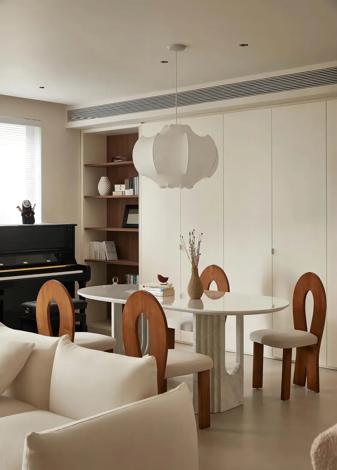 根据原始户型结构,将就餐区域放置在沙发背后。胡桃椅子搭配大理石岩板材质的餐桌,让整个空间质感满满,精致的网红吊灯提升了就餐区域的格调。