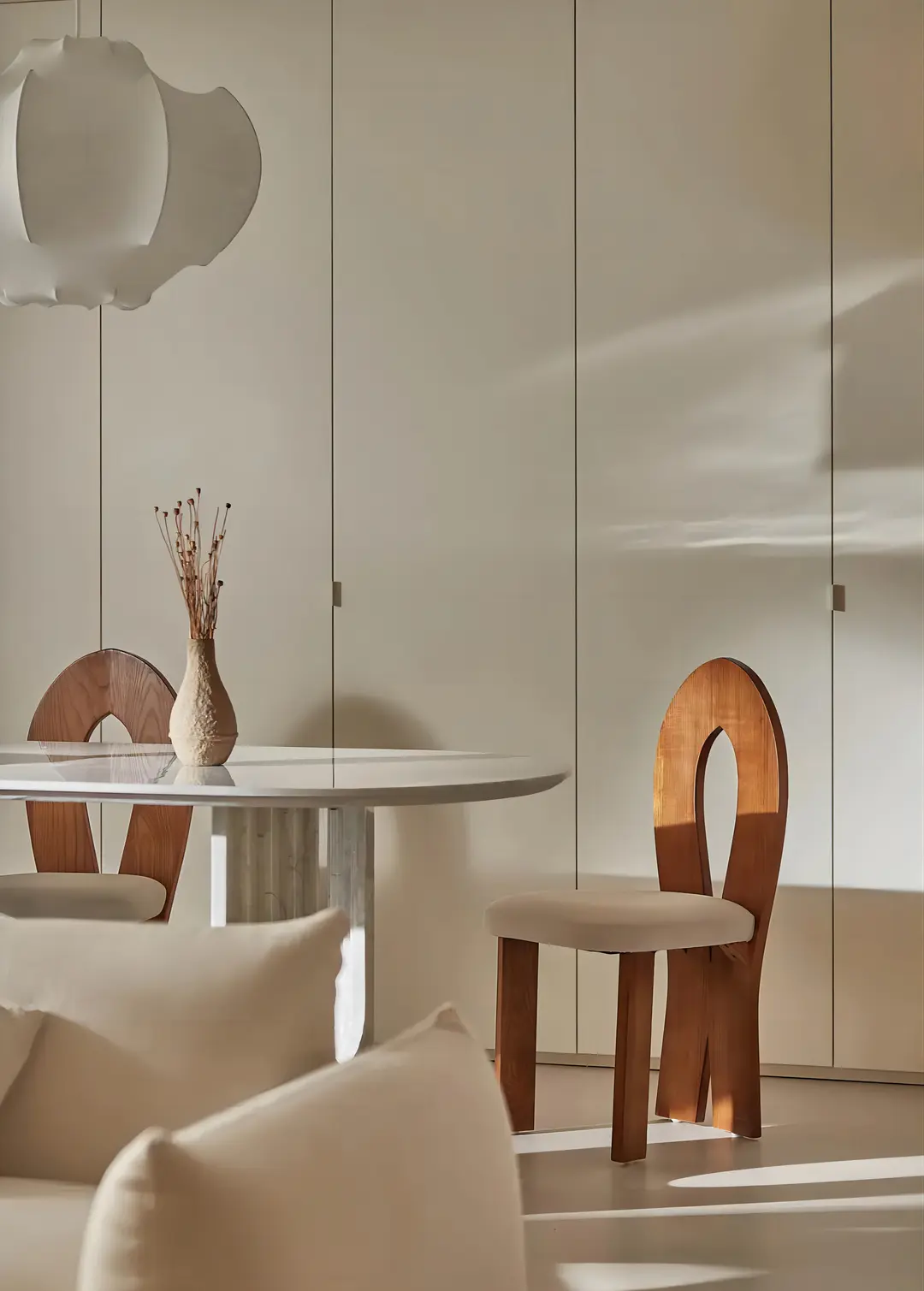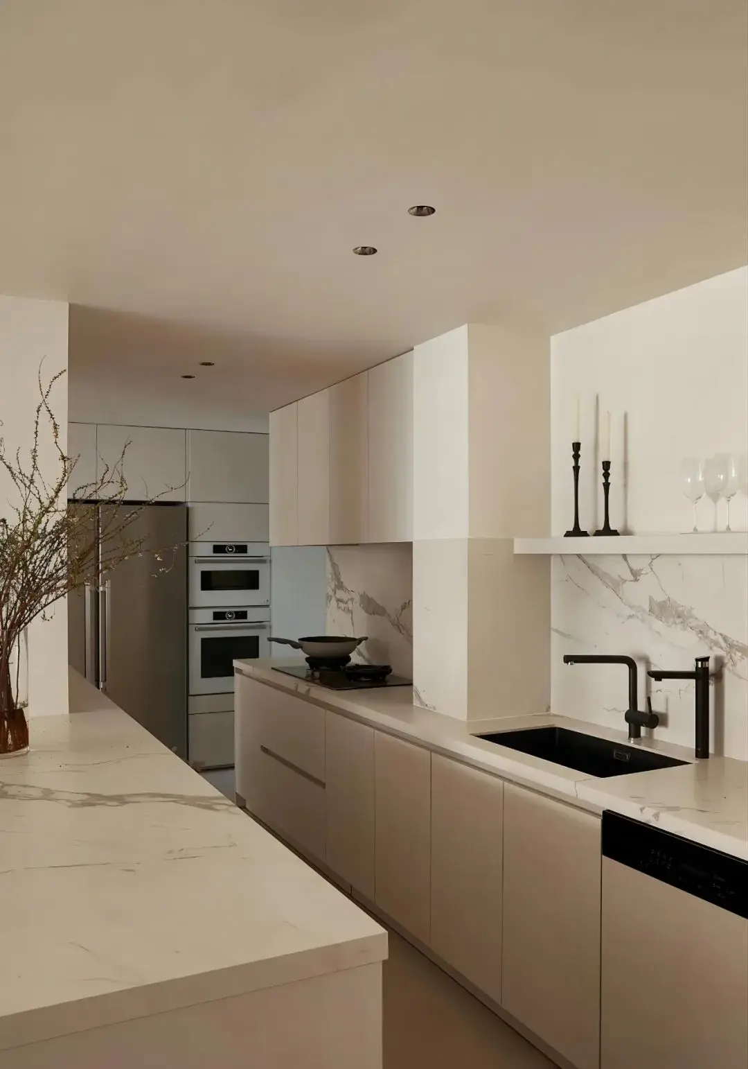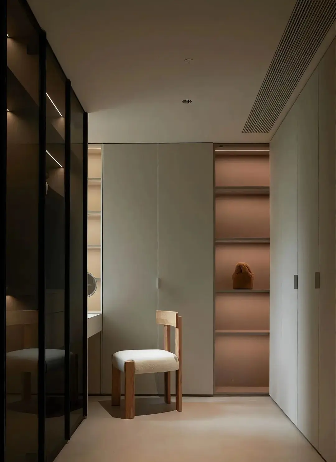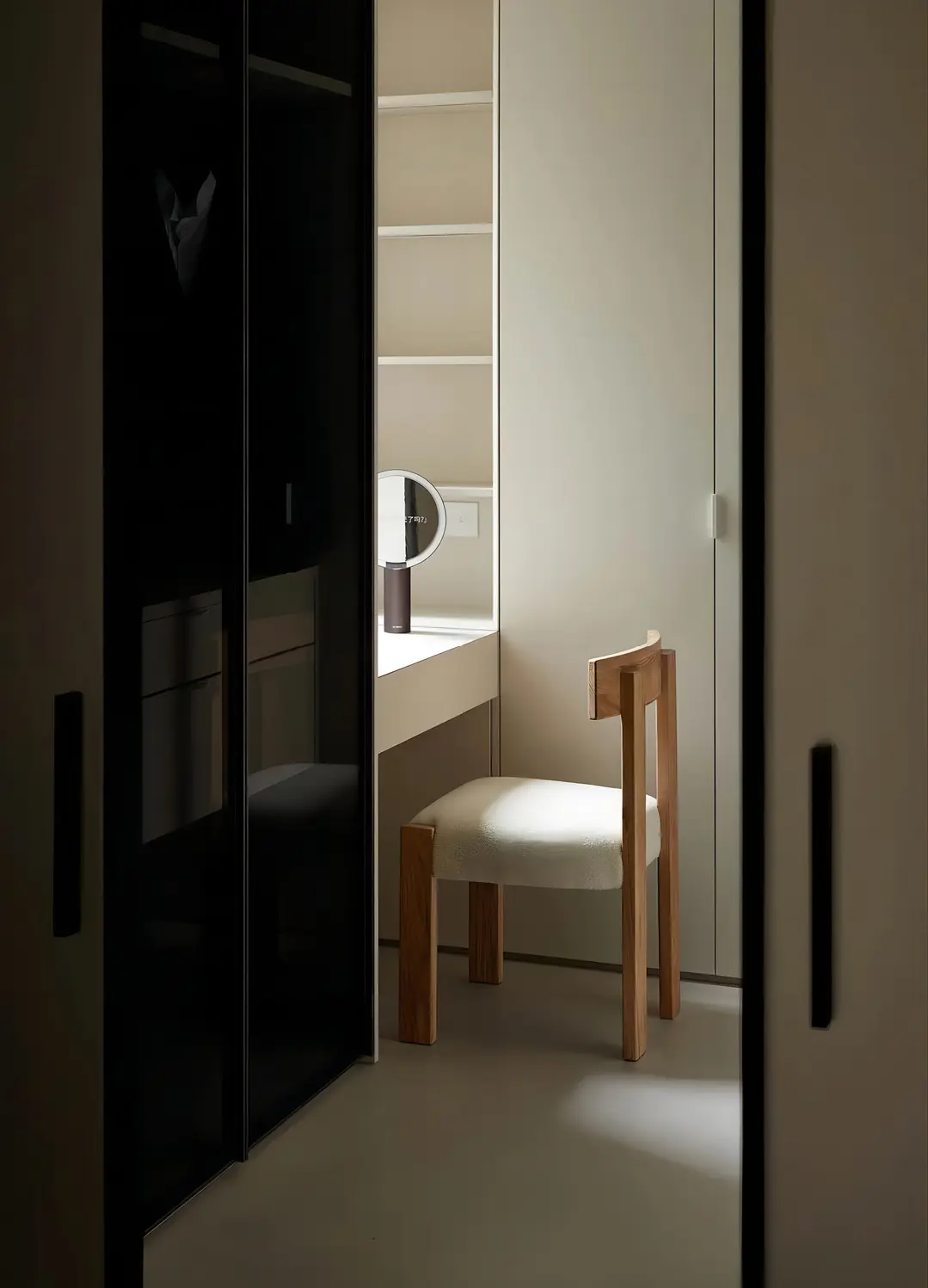 一门到顶的满墙定制柜与整个装修风格完美契合,使用简洁的柜体设计,弱化储物柜的存在,彰显极简魅力。