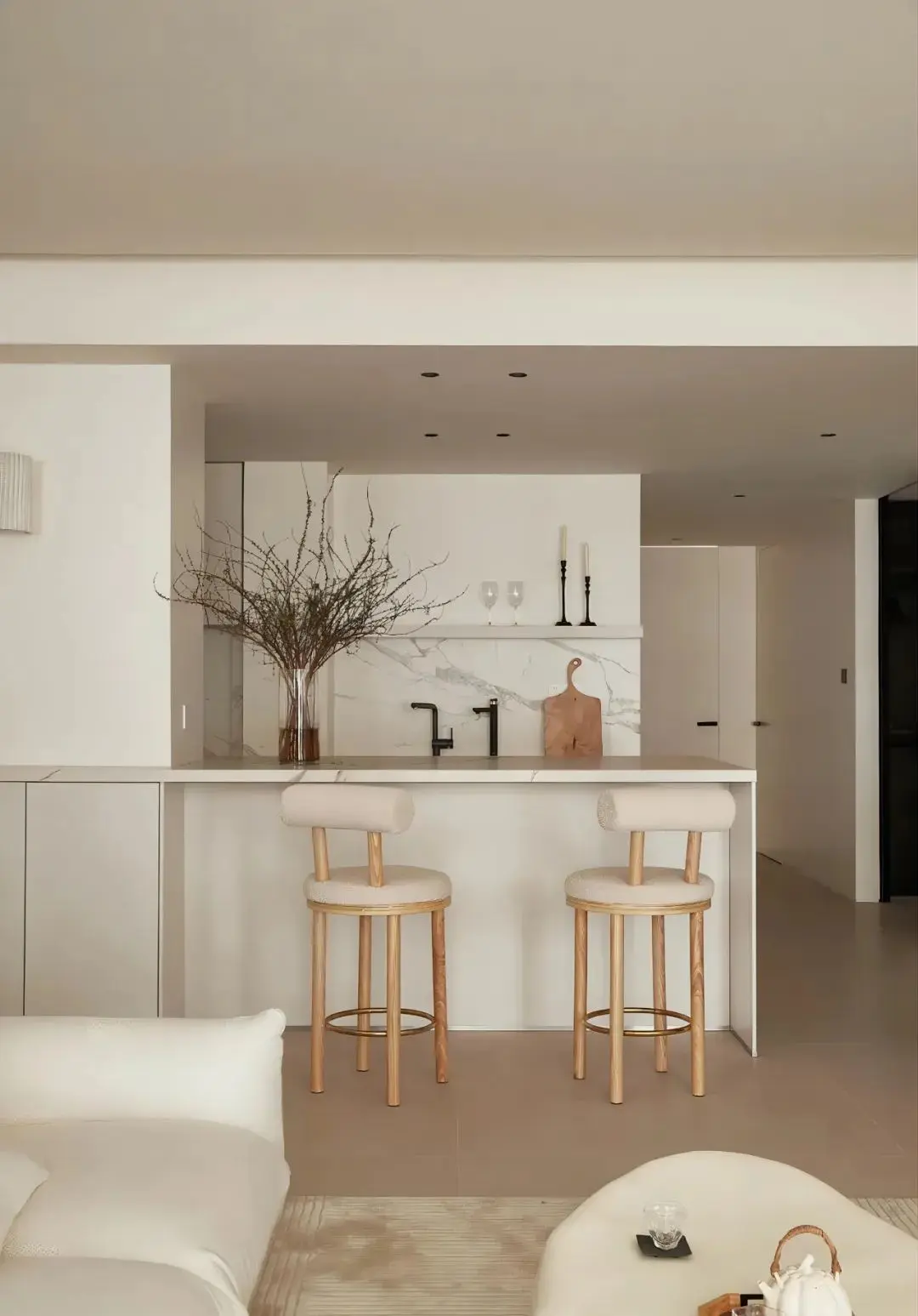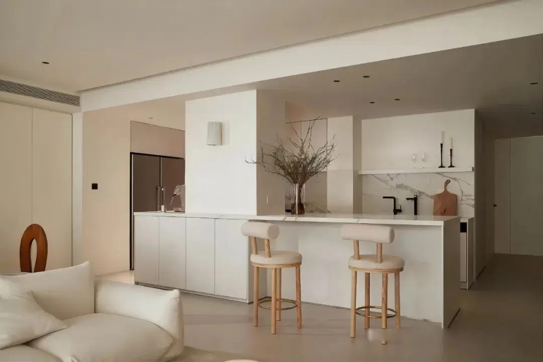 定制吧台与厨房台面平行而置,将承重柱包裹在里面,兼顾颜值与实用性,整个操作动线舒适便捷,既可以作为就餐区,也可以作为茶饮、喝酒的好地方。