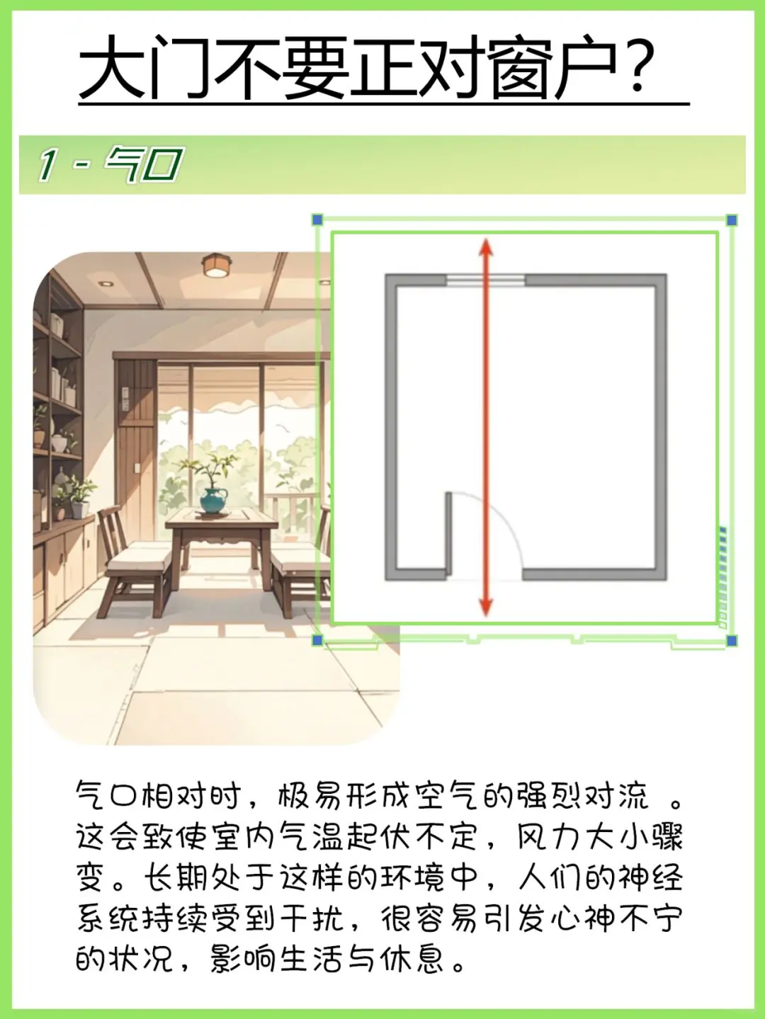 1️⃣大门不要正对窗户 气口相对容易产生强对流,导致气温不稳,风力忽大忽小,影响舒适度。在心理学上,一个安静、隐秘的空间可能会让人感到放松和安全,而过于直通的通道可能会让人感到暴露和不安。