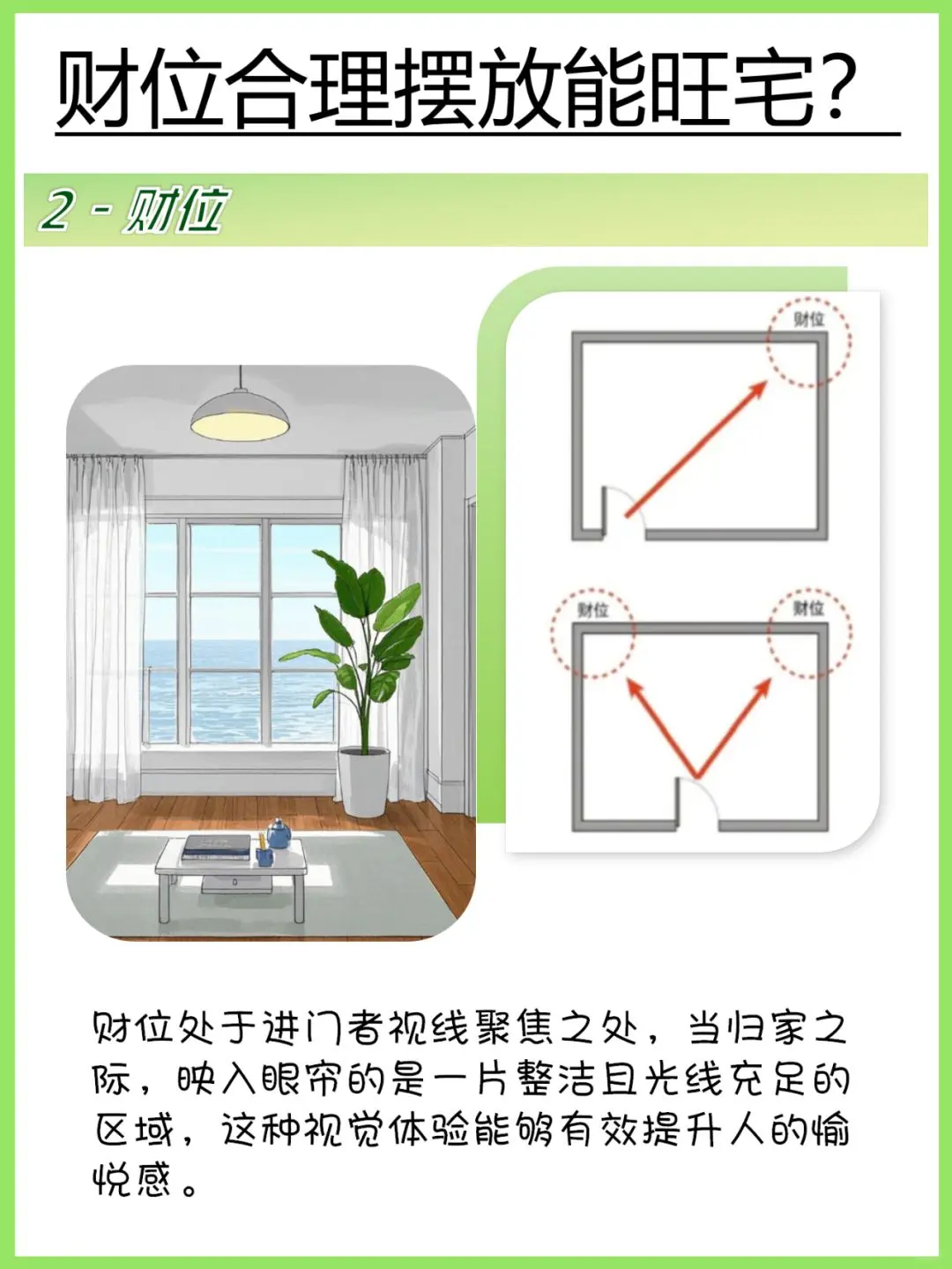 2️⃣“财位”合理摆放能旺宅 大门正对客厅的一个或两个对角线是财位,需要保持干净整洁、光线充足、摆放一些寓意美好的物品。财位是进门人视线集中的位置,不管是自己或是客人,回家看到一块整洁明亮的区域能让人心情愉悦。