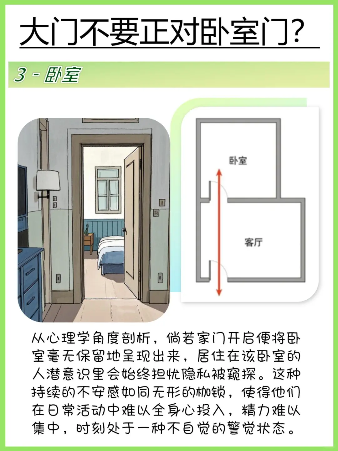3️⃣大门不要正对卧室门 卧室和大门,两门成一条线对冲代表对金钱财运不利,且不利家人健康。卧室是一个人最隐私的地方,若开门就看到卧室,个人隐私容易暴露。从心理学上来说,住在这个卧室的人担心被人窥视,容易精力不集中。