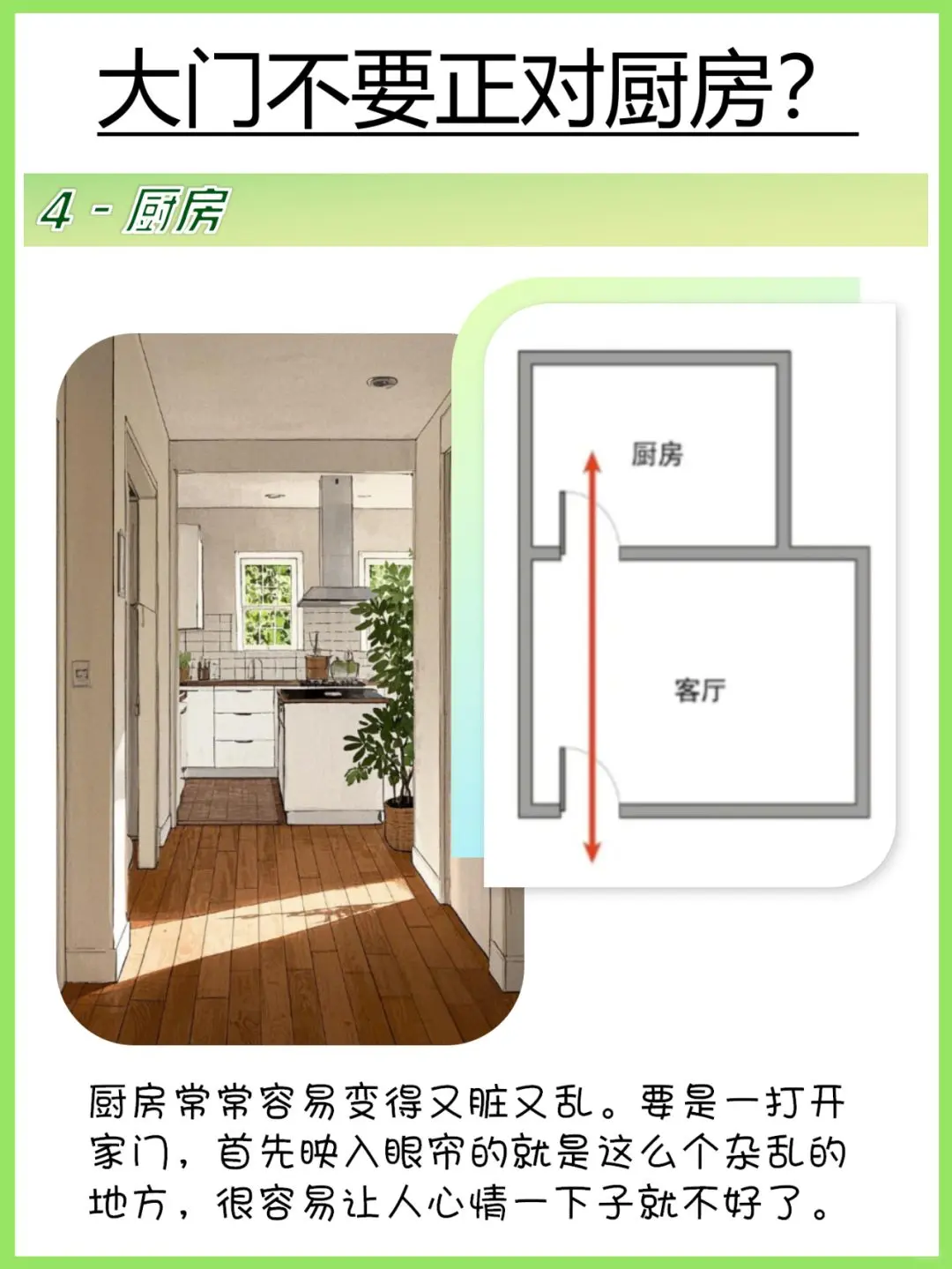4️⃣大门不要正对厨房 开门见灶,钱财多耗,进入入户门后第一眼看见灶,则火气冲人,财气无法进入。厨房一般是比较容易脏乱的地方,不管是自己或者是客人,进门后第一眼就看到脏乱的地方容易让人心情低落。